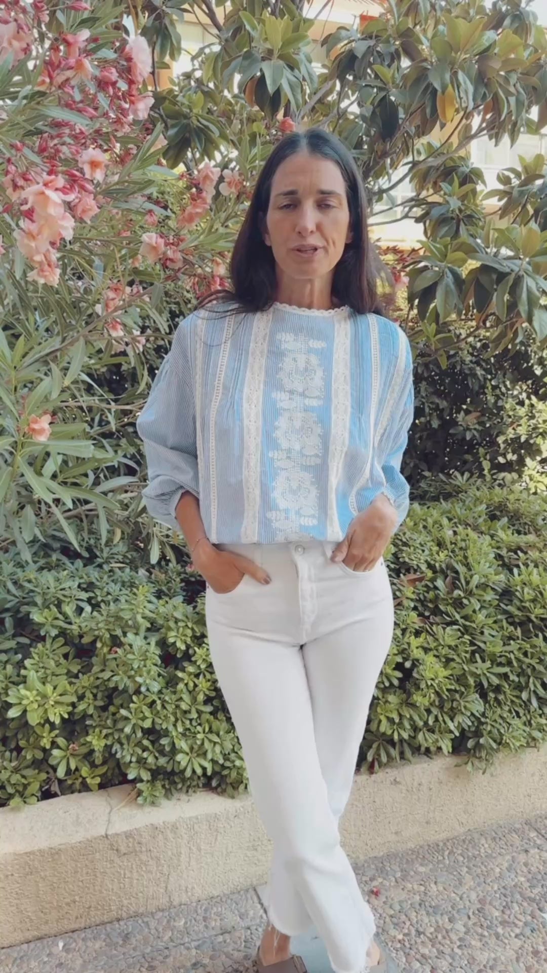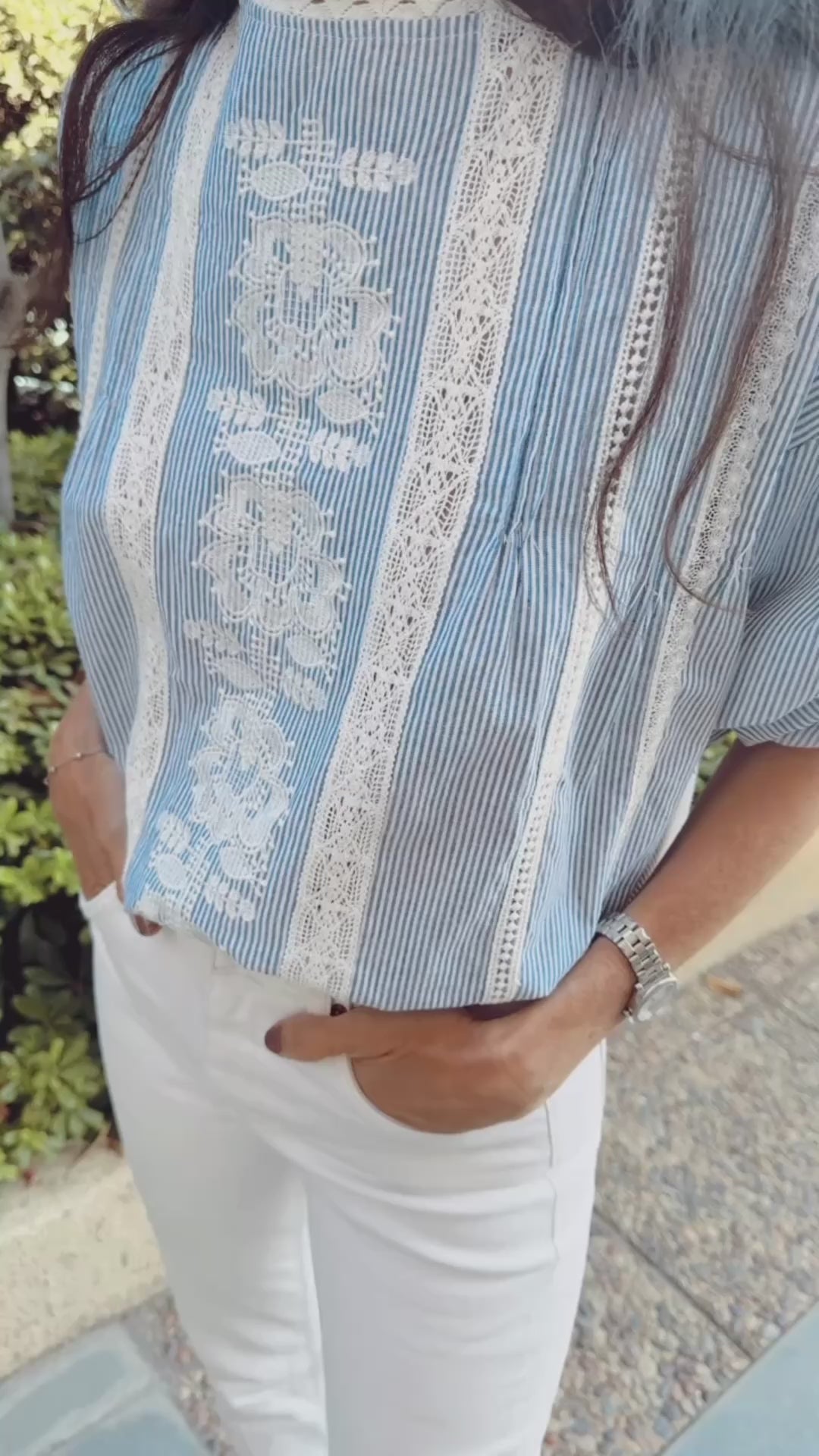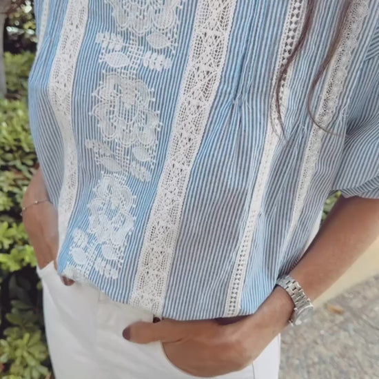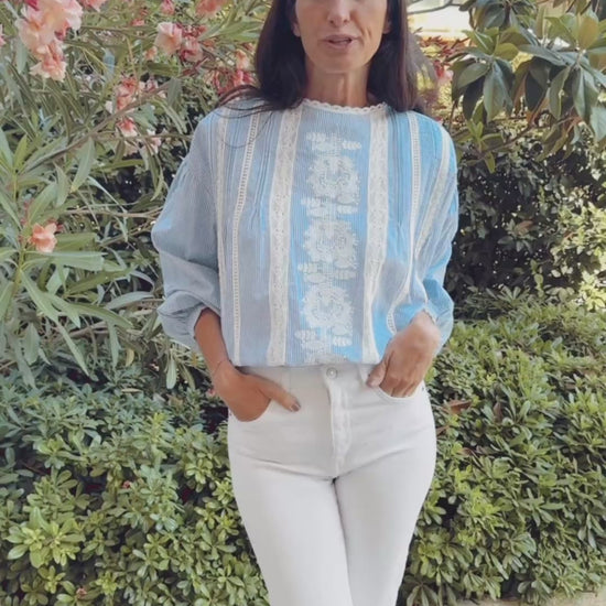Blusa de algodón rayado azul y blanco. La prenda tiene detalles de puntillas y bordados de algodón en el frente.