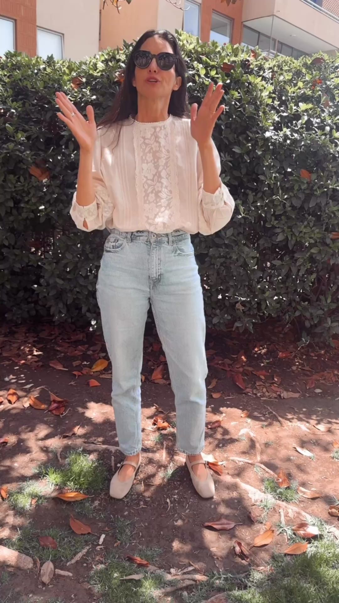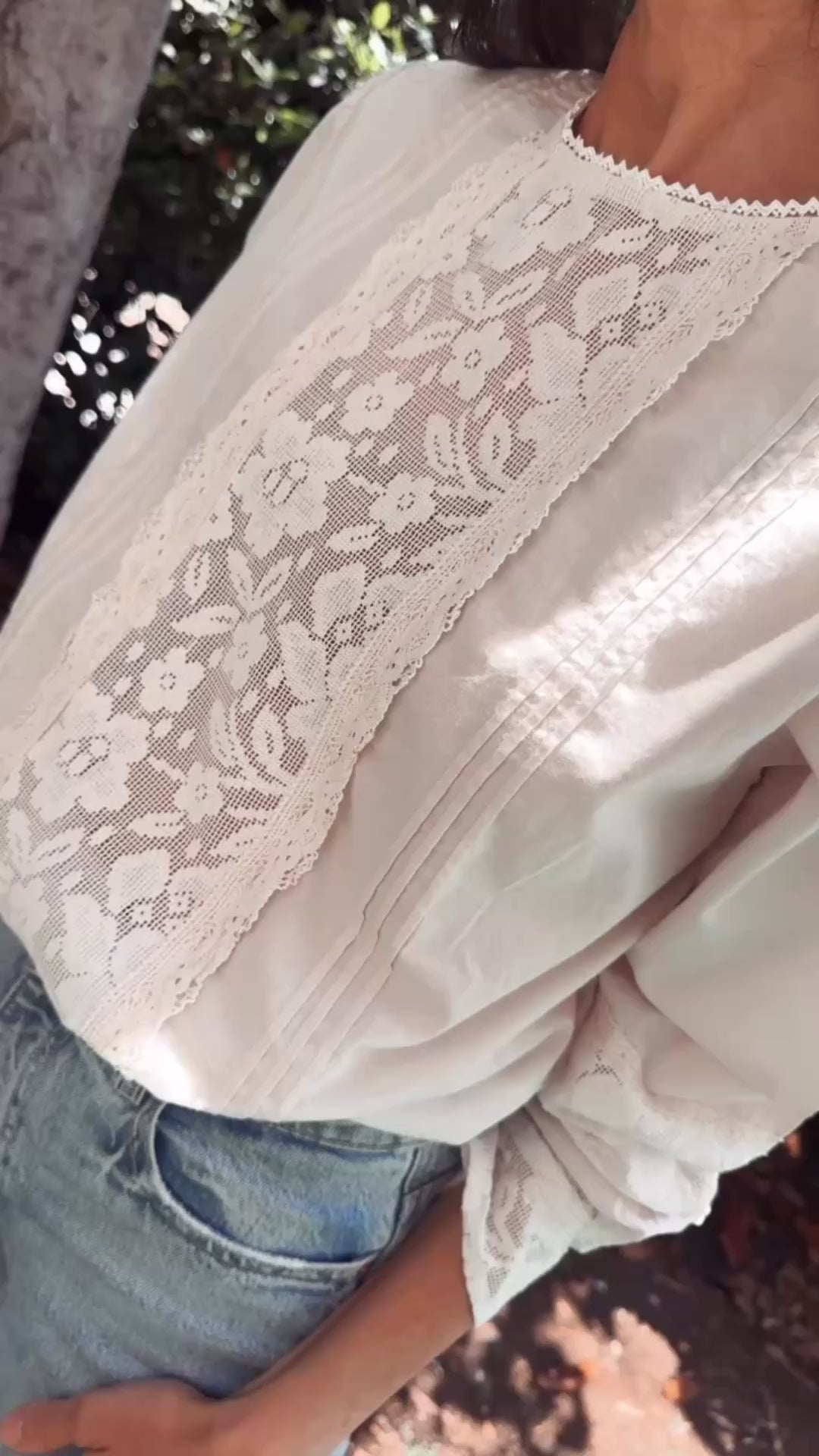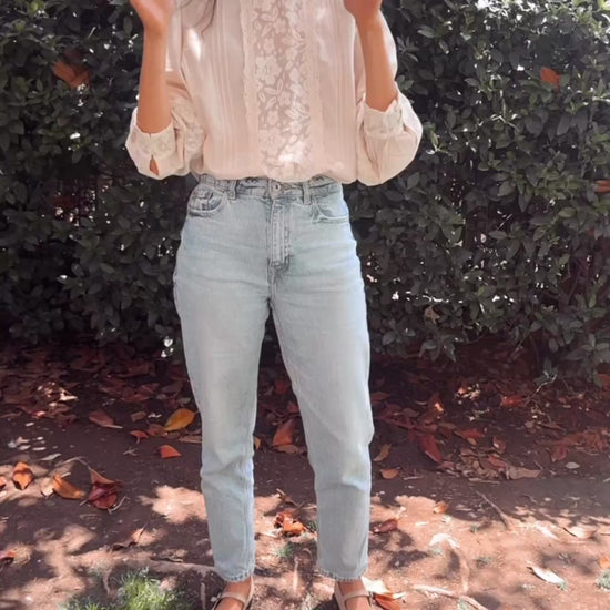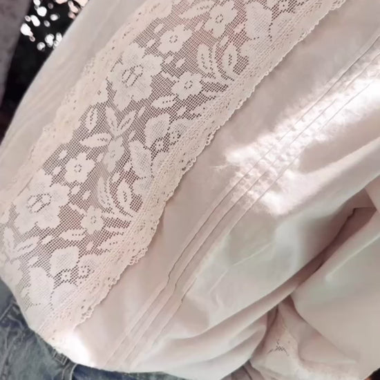 Blusa con detalle de puntilla en pecho. Mismo detalle en mangas y terminación de puño. Alforzas laterales.