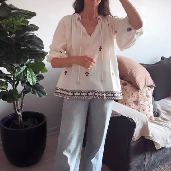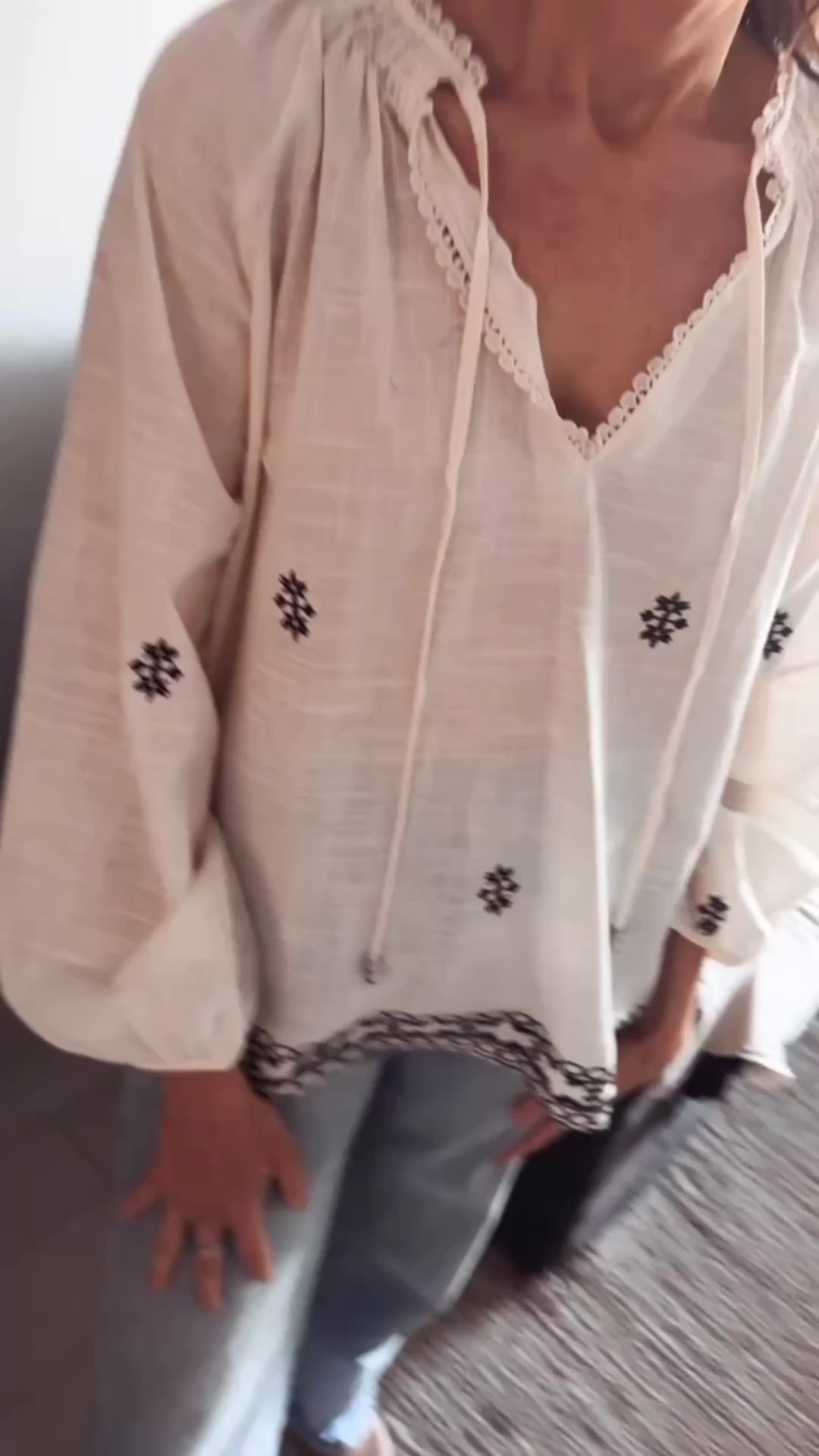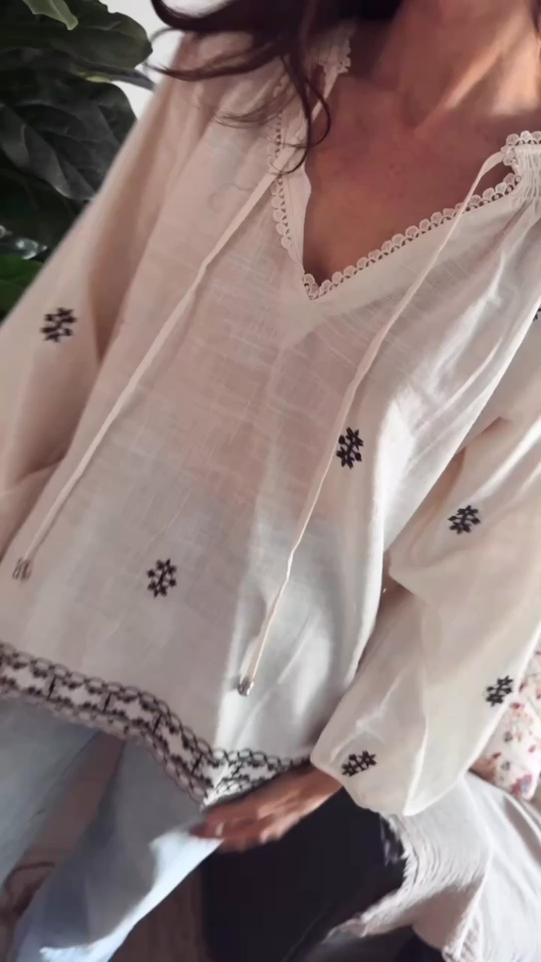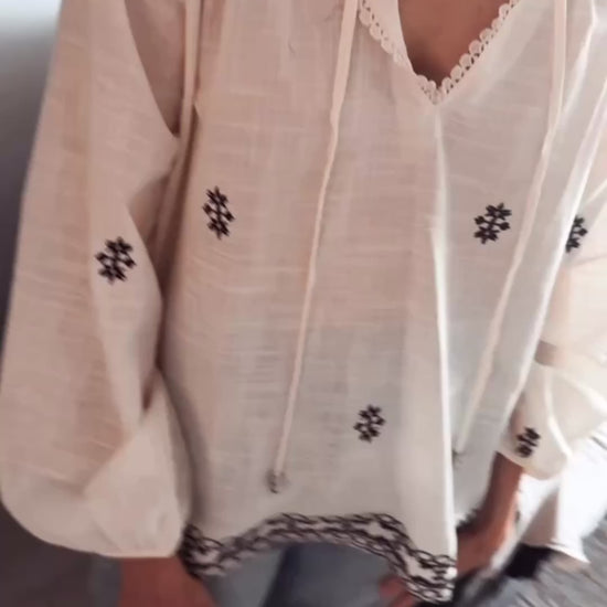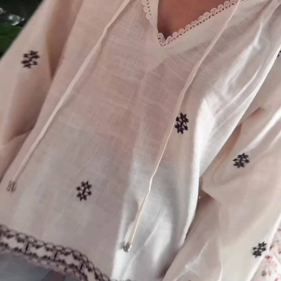 Blusa con detalles de boradodas en negro. Esote V con terminacion de puntillas. laxos delanteros.