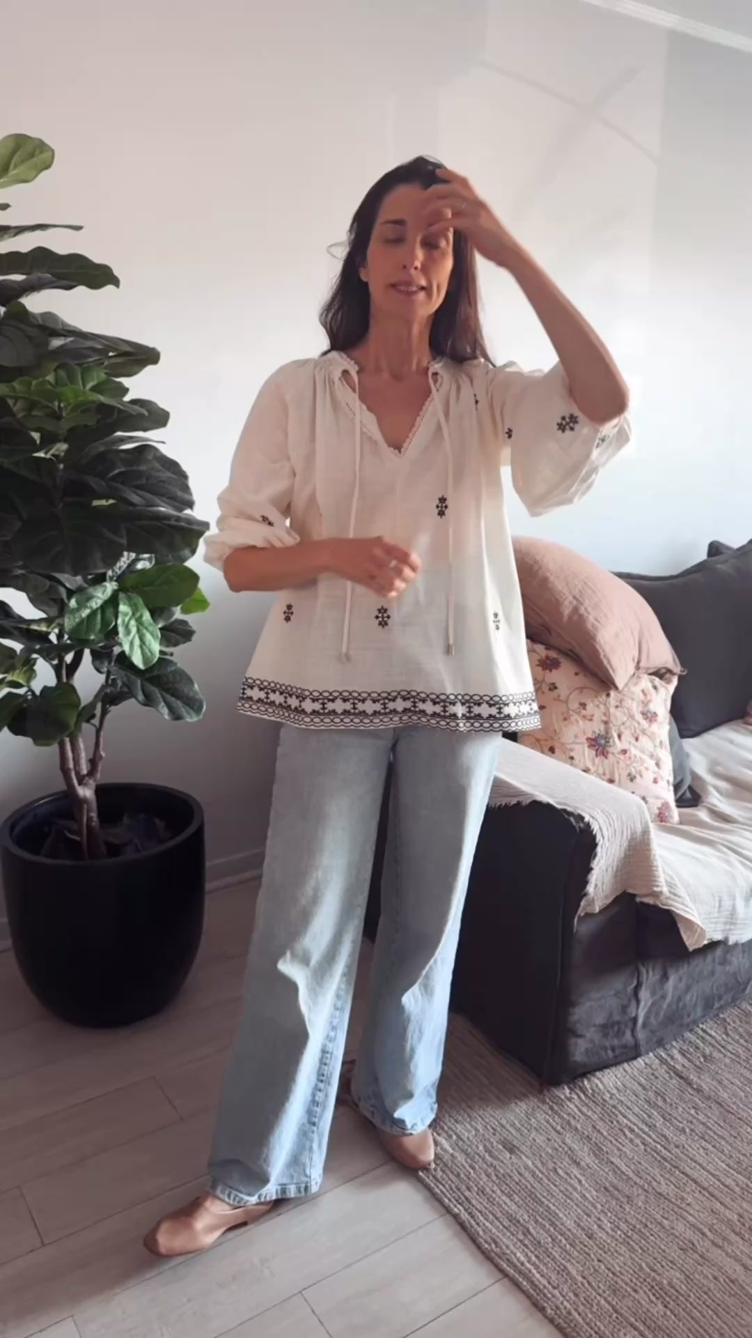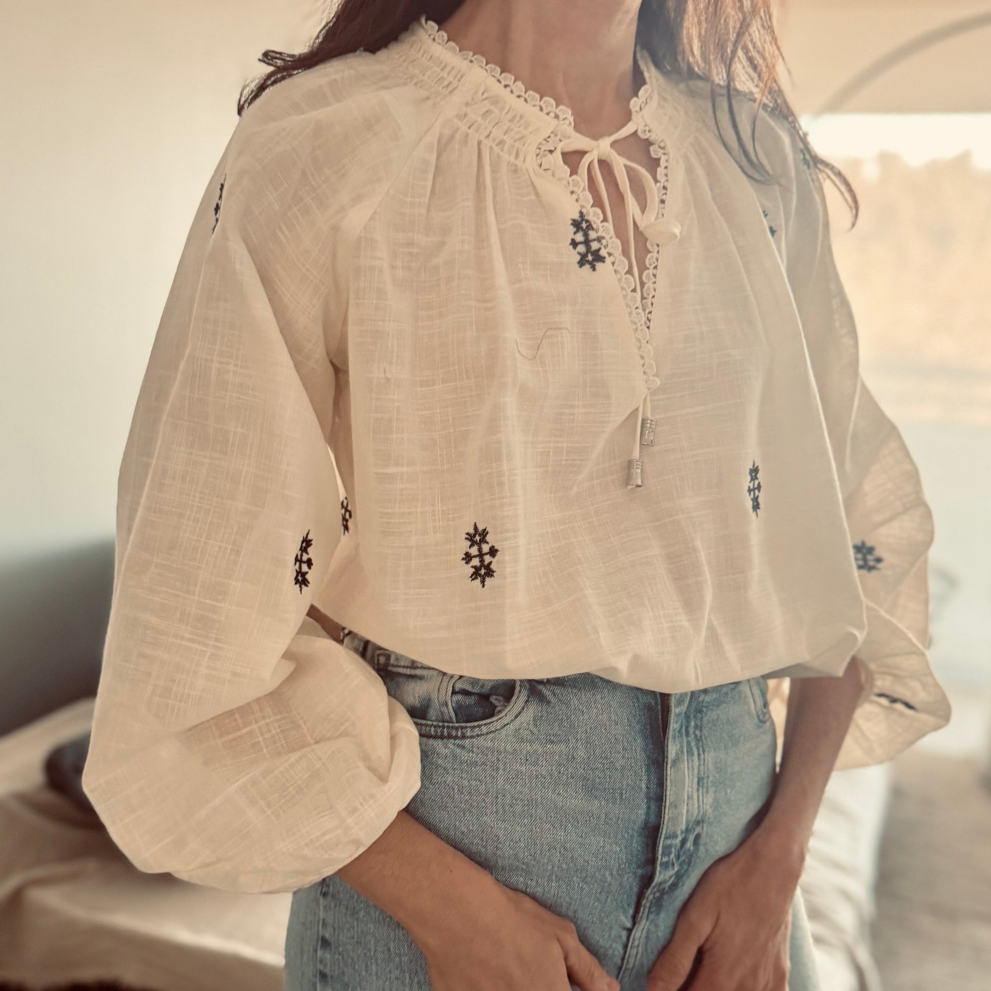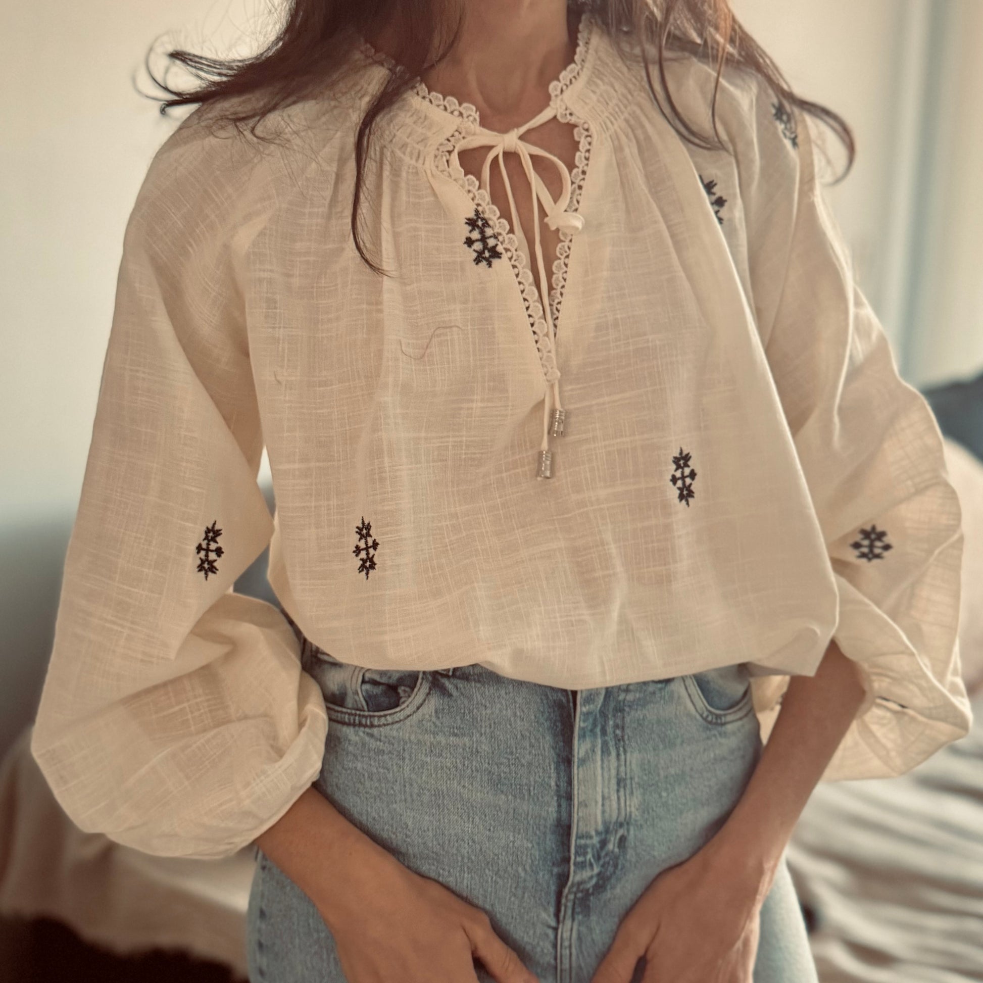 Blusa con detalles de boradodas en negro. Esote V con terminacion de puntillas. laxos delanteros.