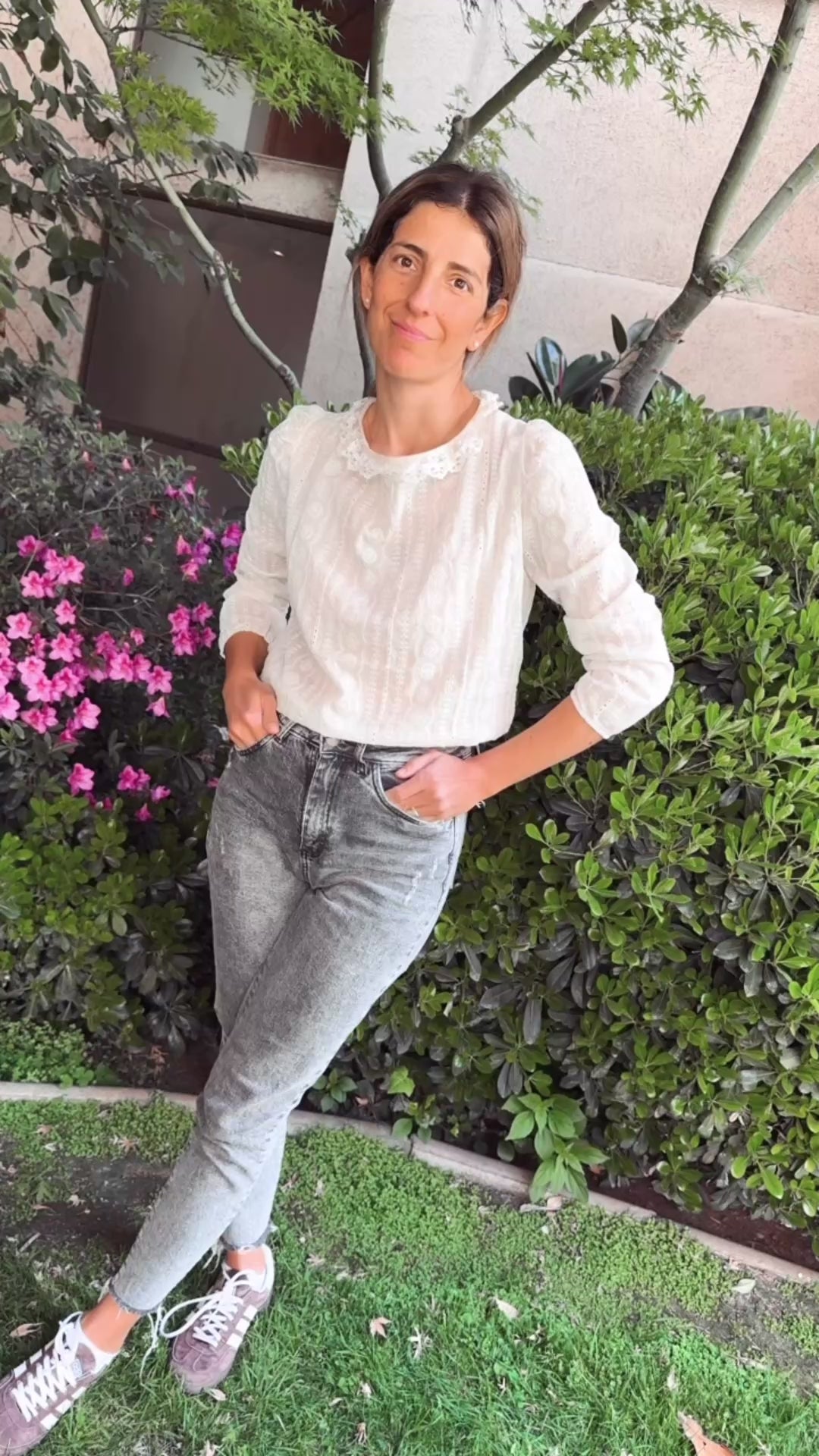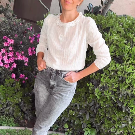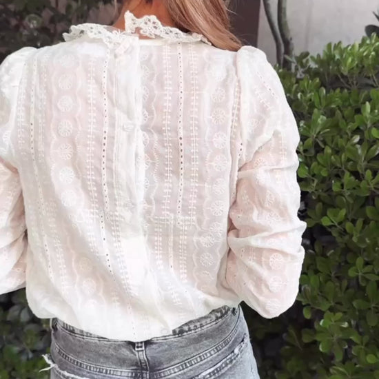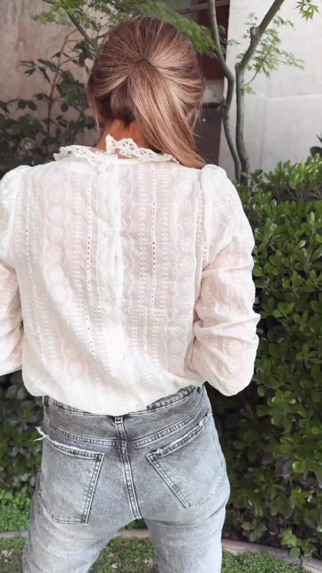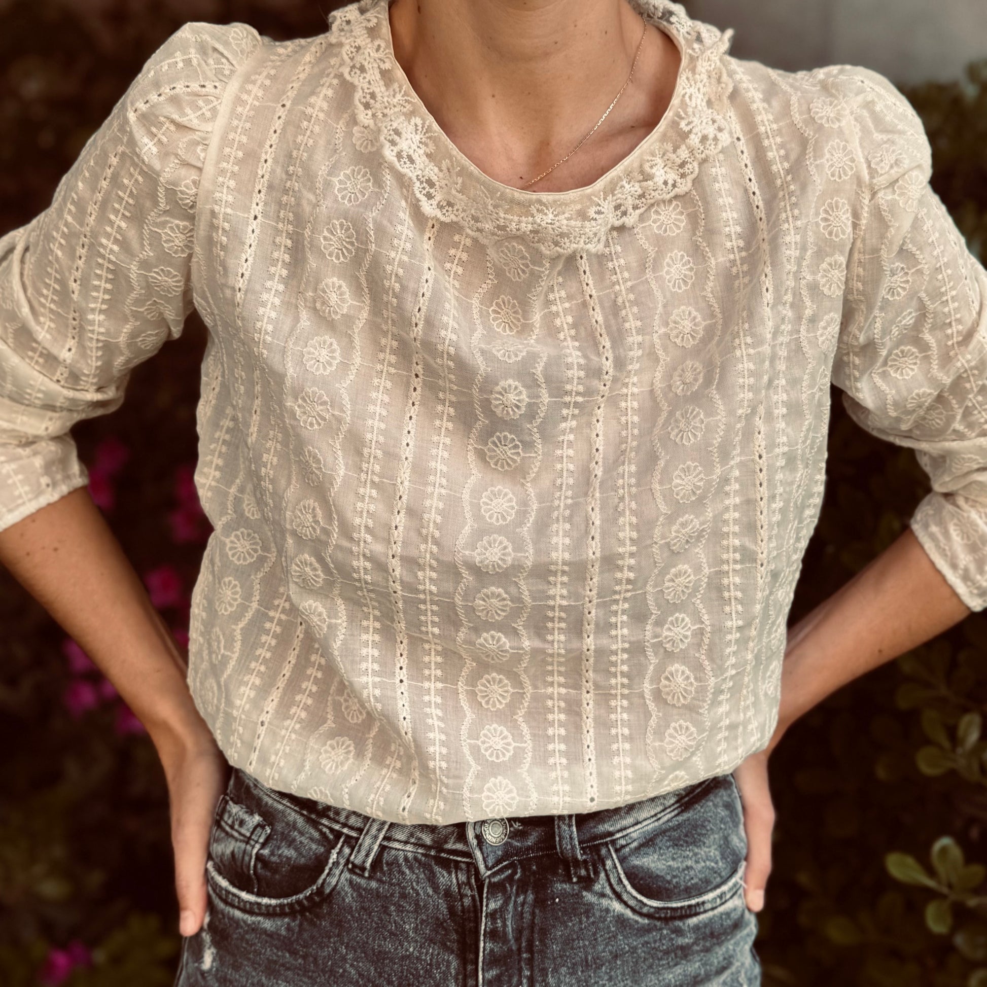 Blusa con detalle de tiras bordadas y cuello babero de tul.
