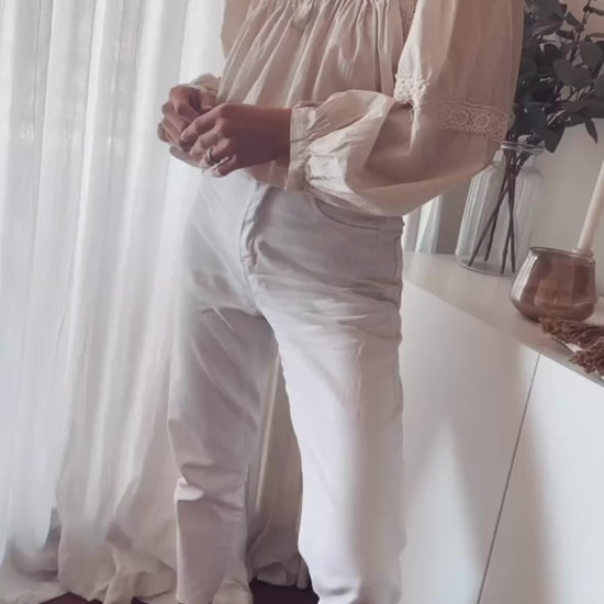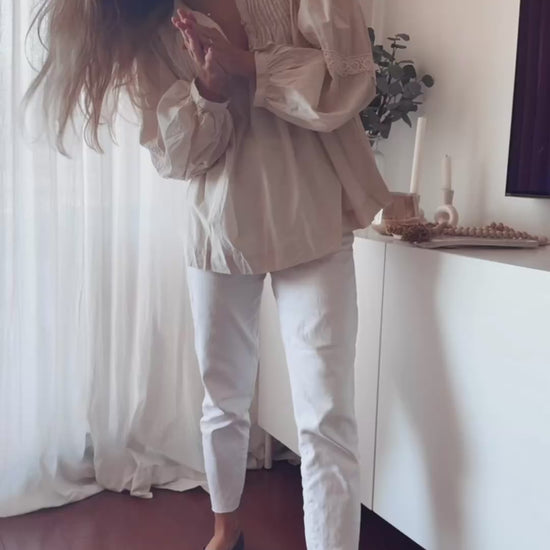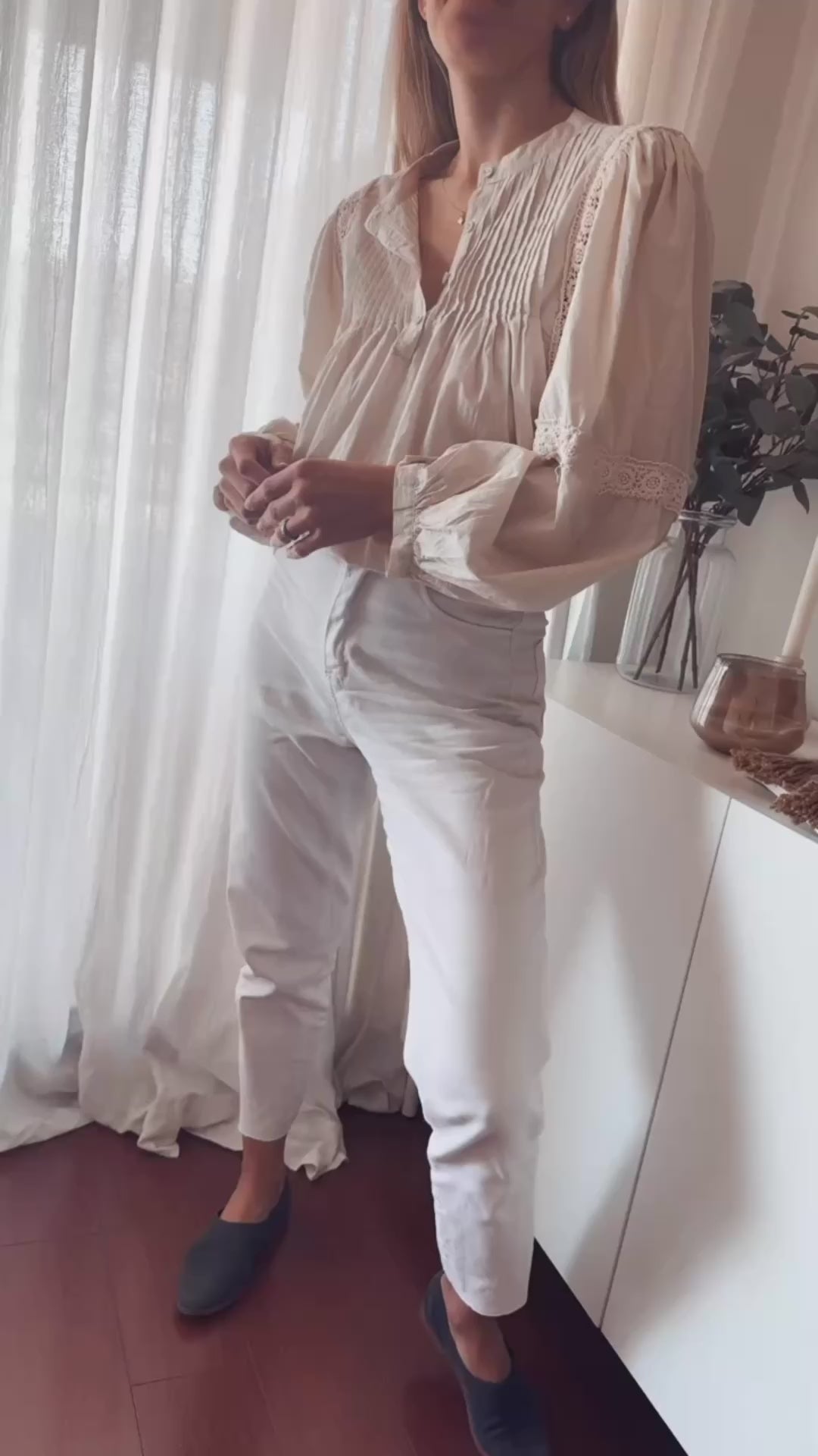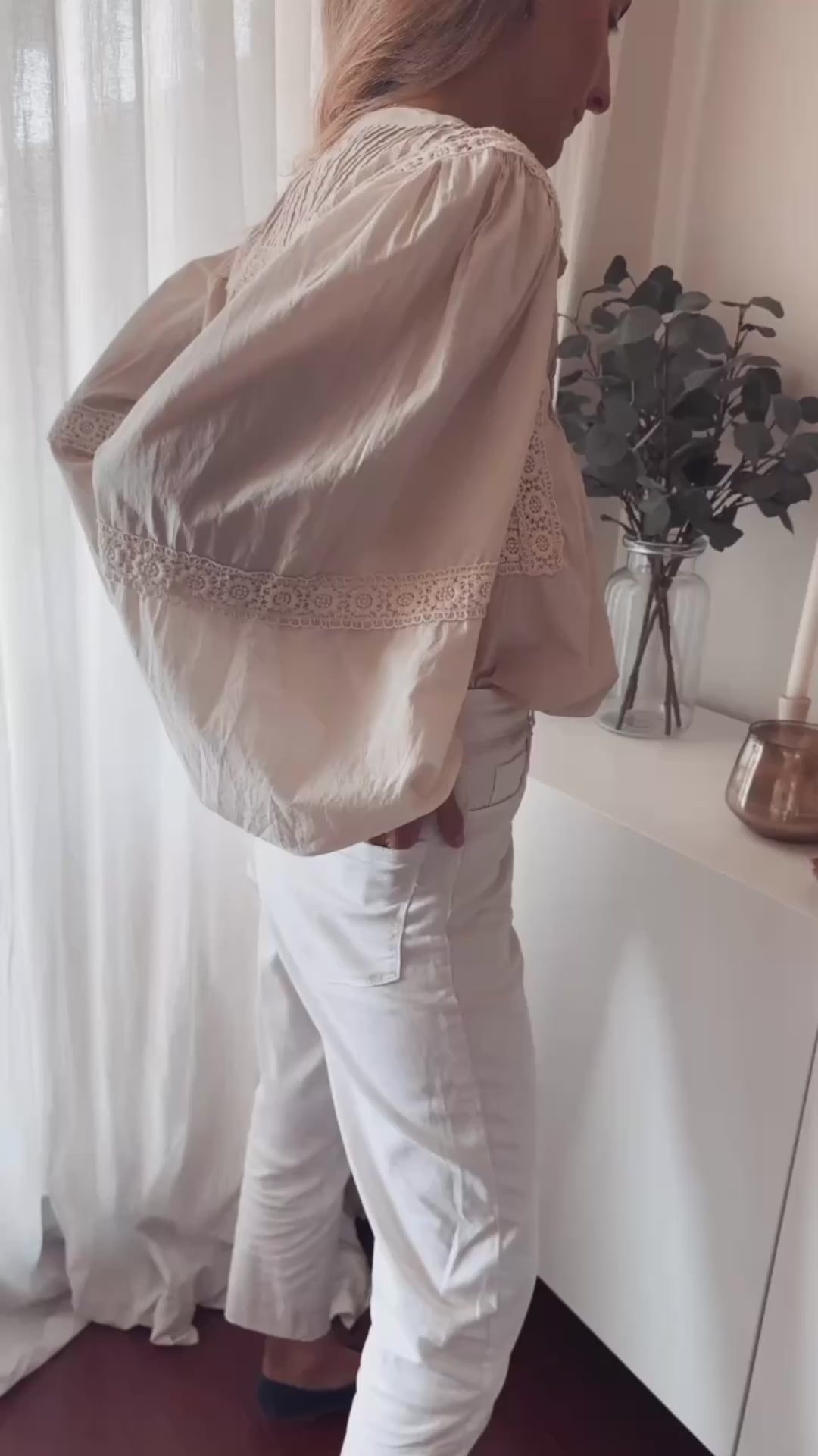 Blusa con detalle de alforsas y 3 botones delanteros. Puntillas delante, atras y en mangas.