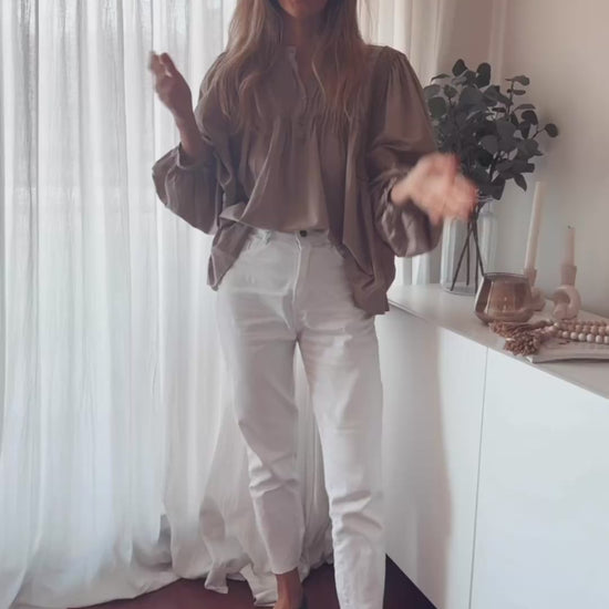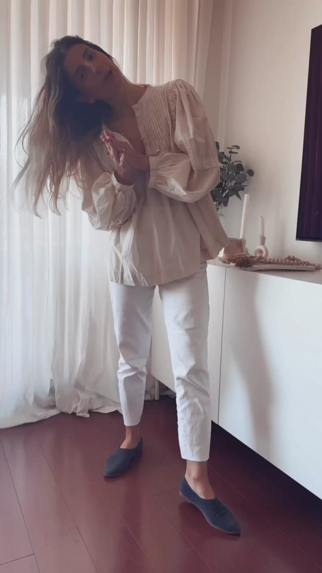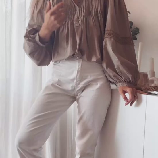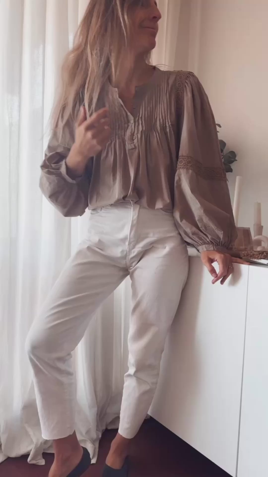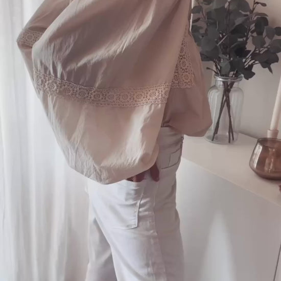 Blusa con detalle de alforsas y 3 botones delanteros. Puntillas delante, atras y en mangas.
