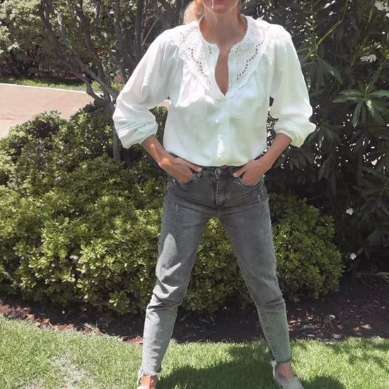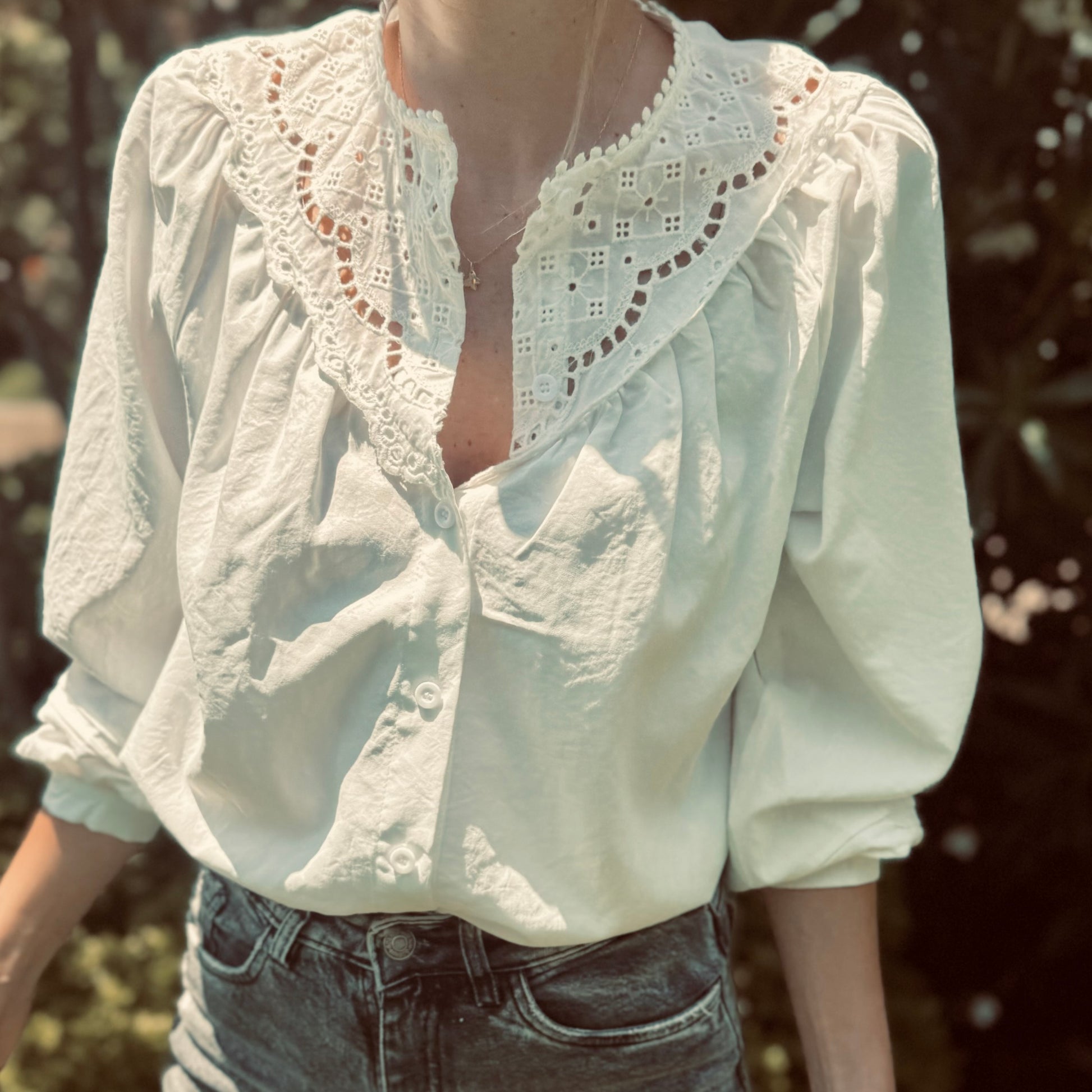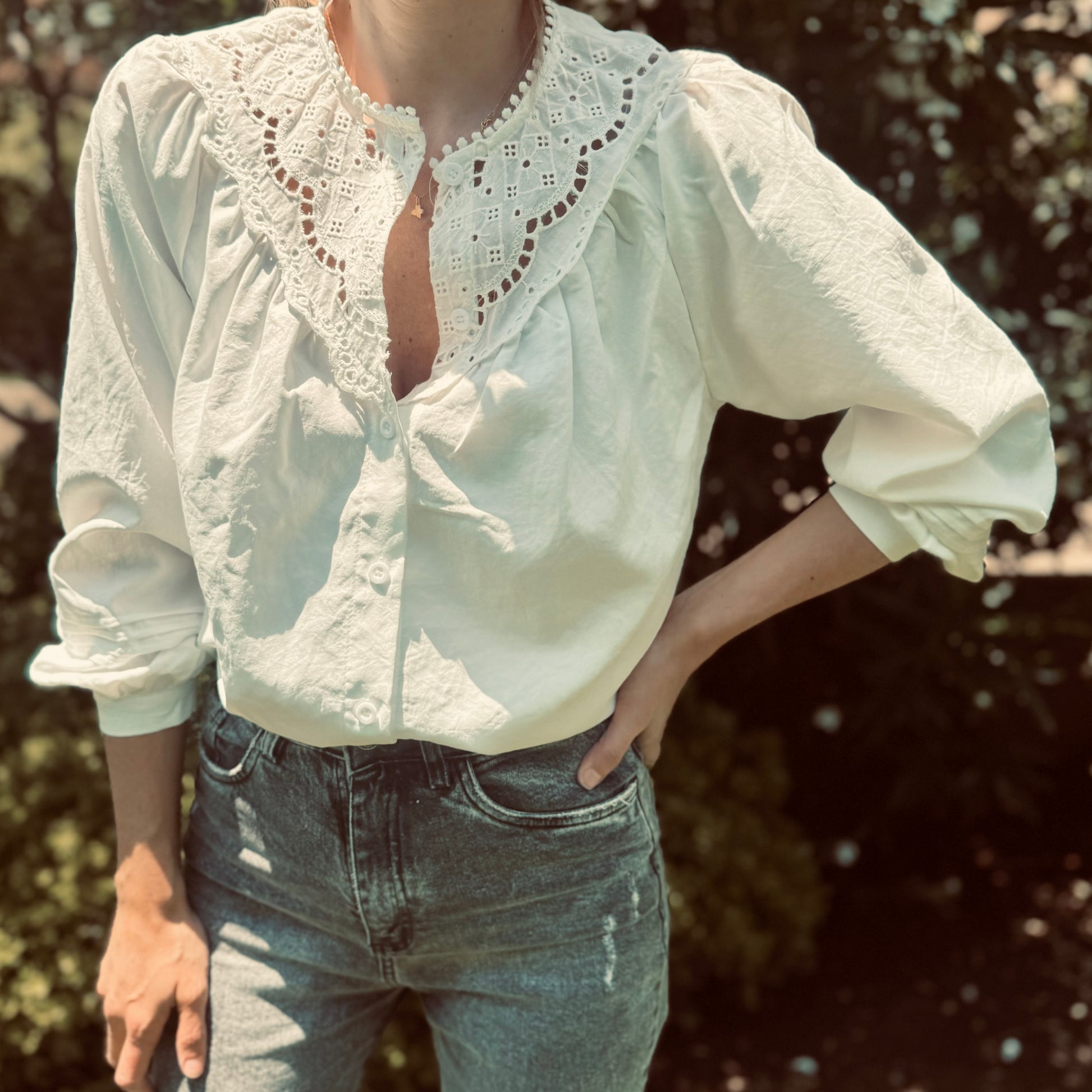 Camisa con detalle ahuecado en pecho, en forma de V. Cuello redondo. Alforzas en mangas laterales.