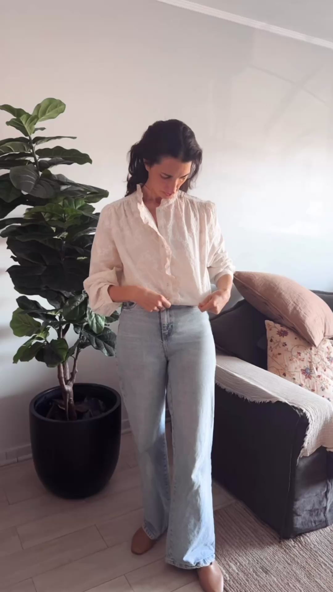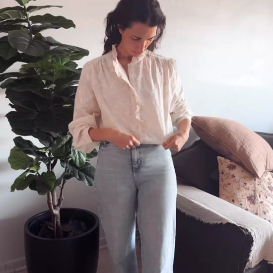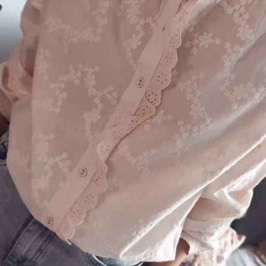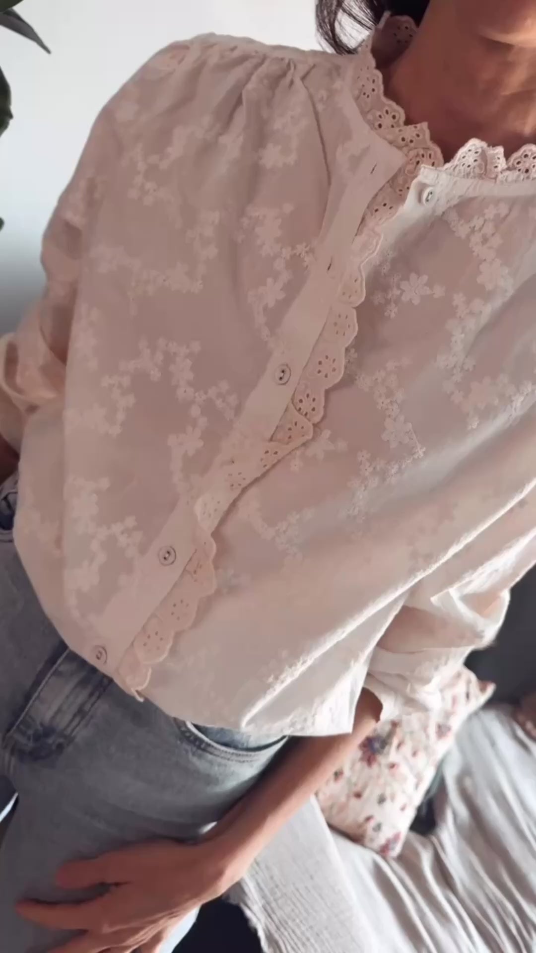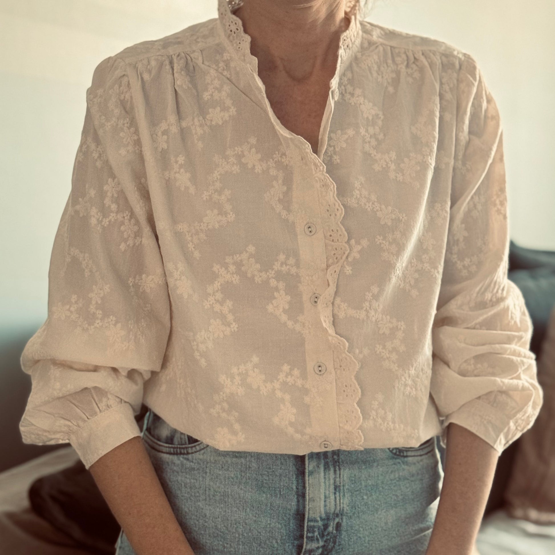 Camisa integra de broderie. Detalle de puntilla al lateral de botones y cuello.