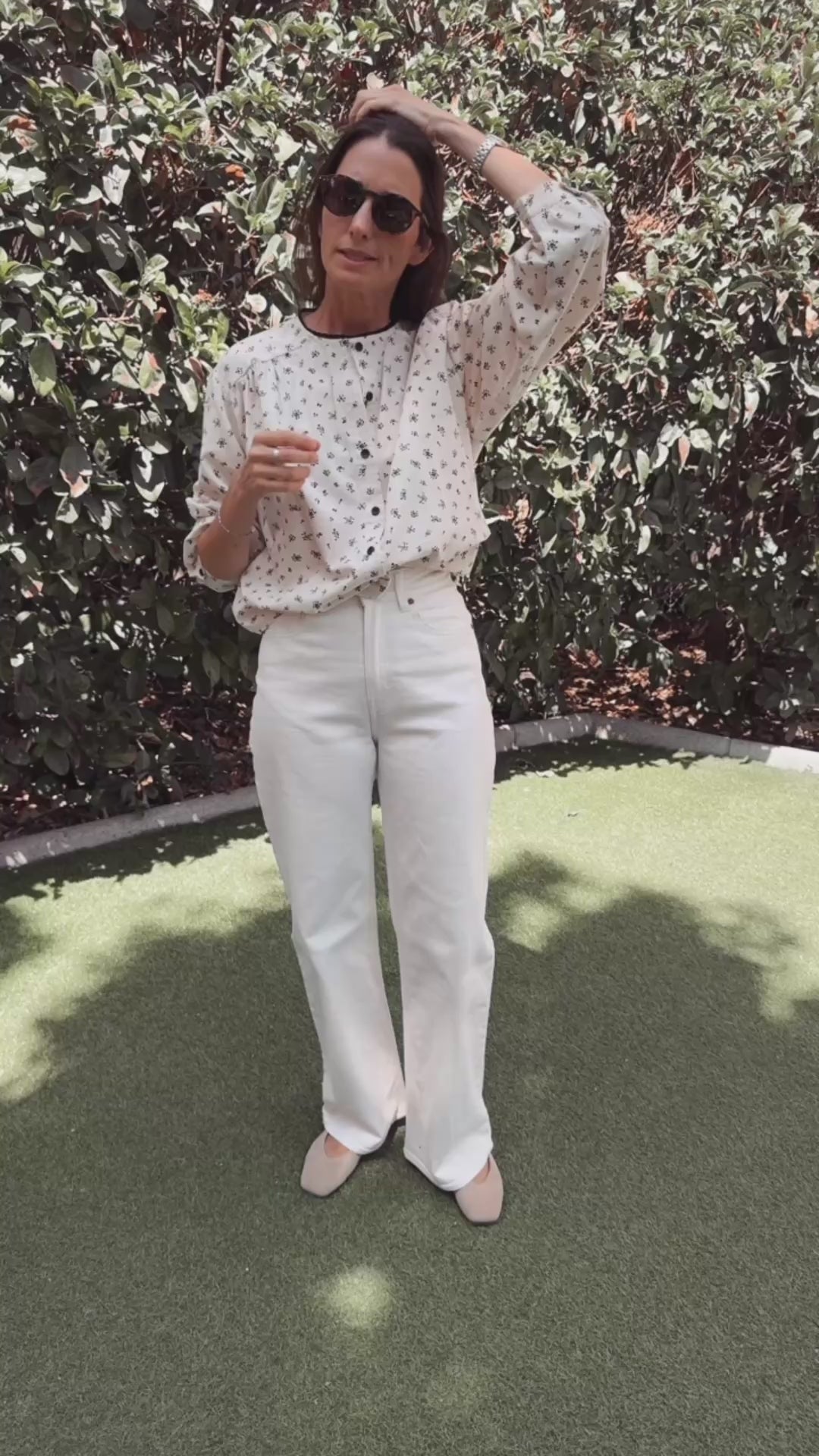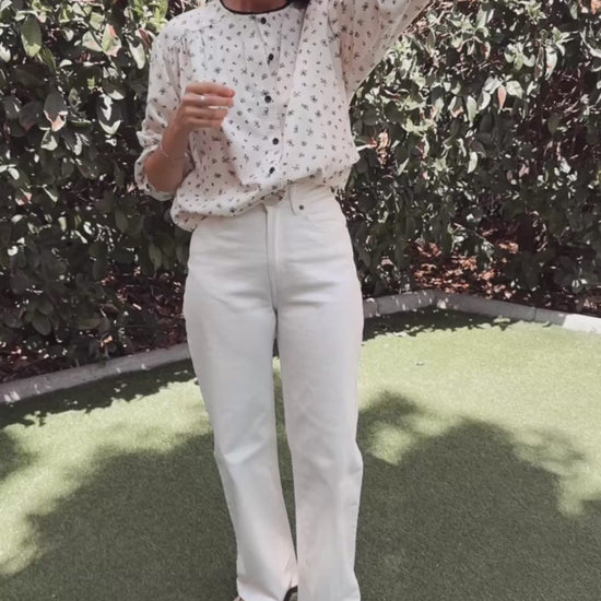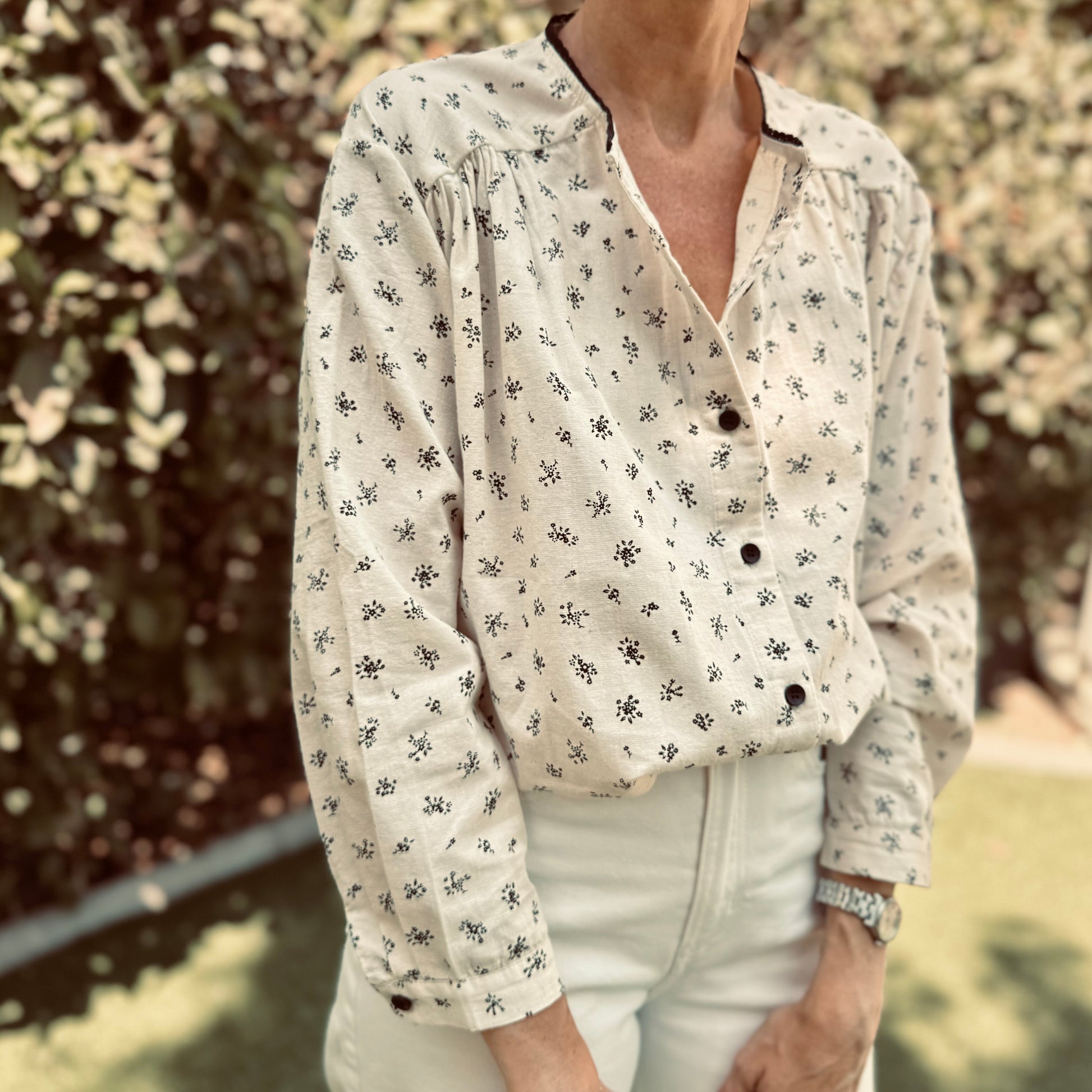 Camisa de algodón liviano rústico estampada con delicadas flores negras. Cuello con terminación en puntilla y botones negros haciendo juego.