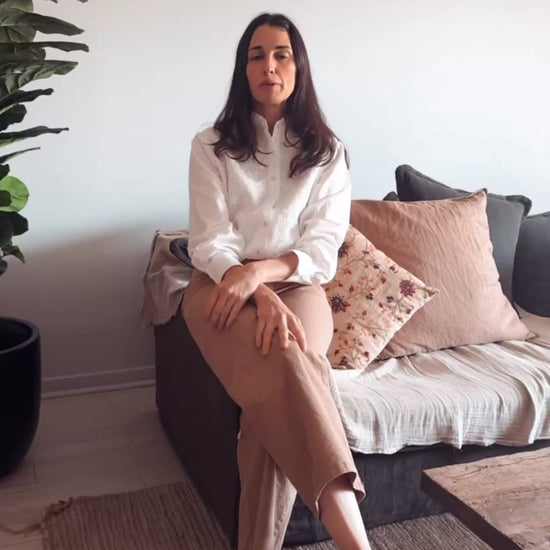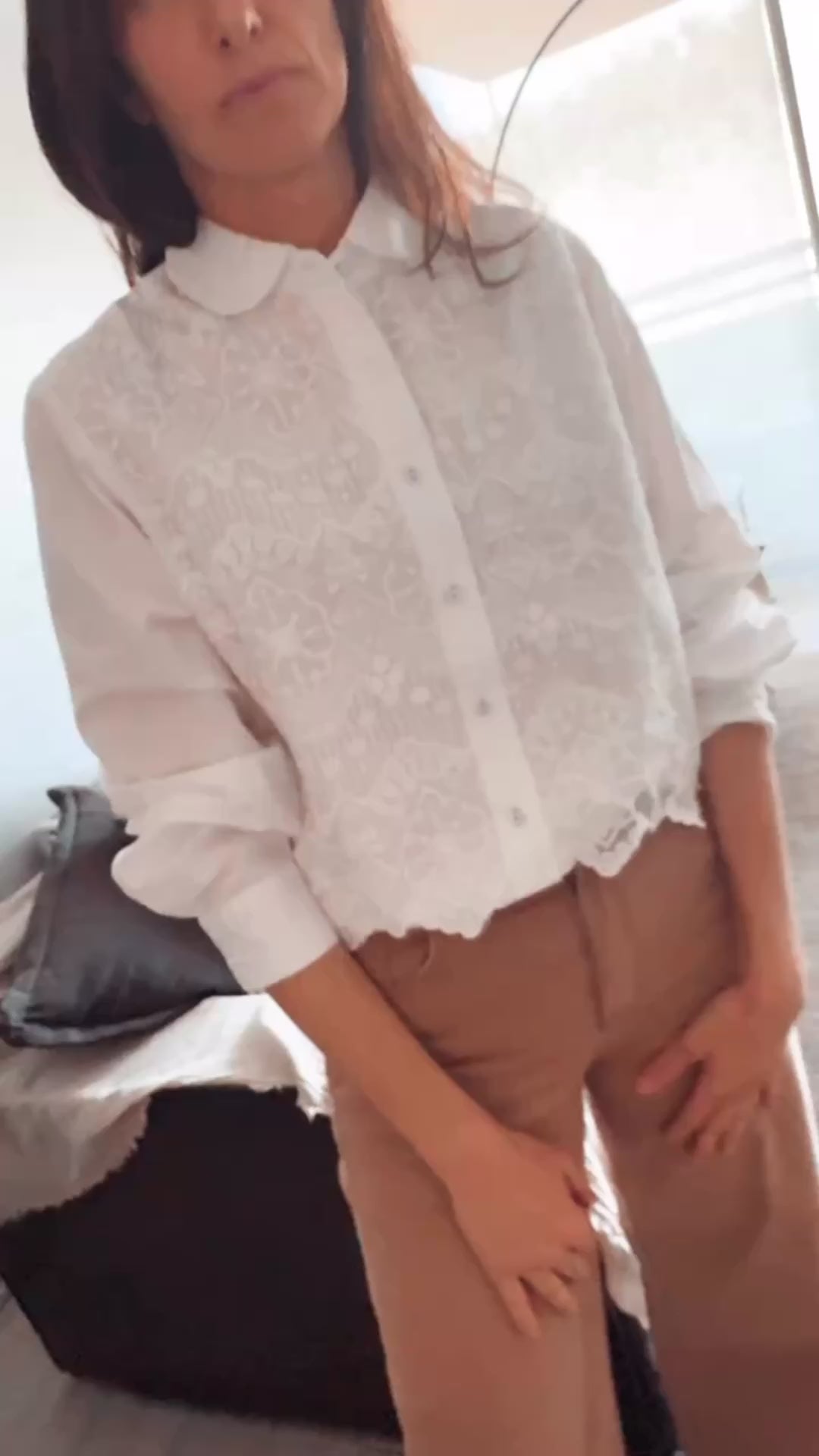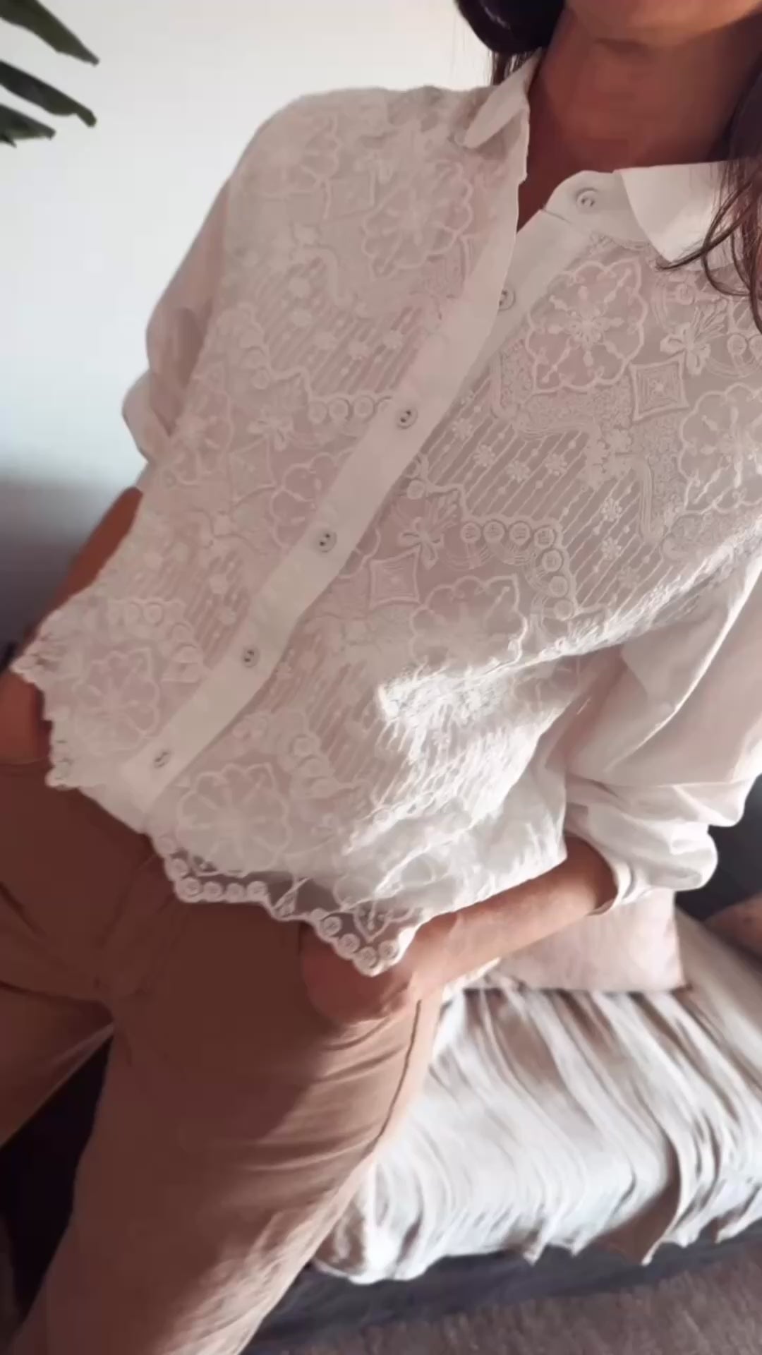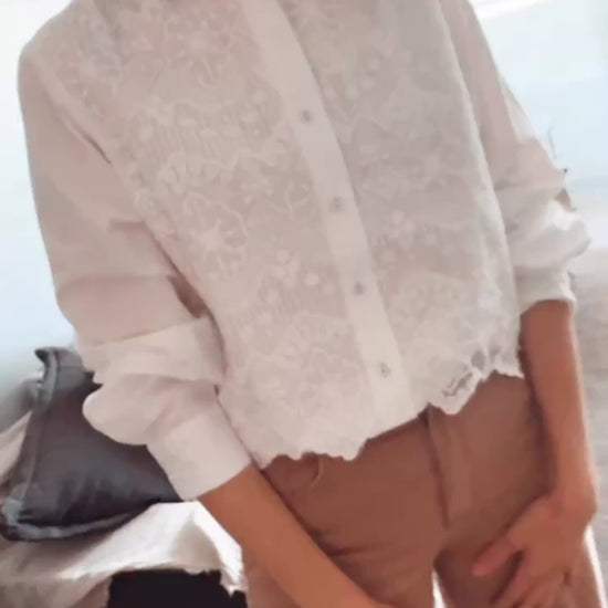 Camisa corte tradicional. Botones forrados. Detalle de tela de puntilla superpuesta.