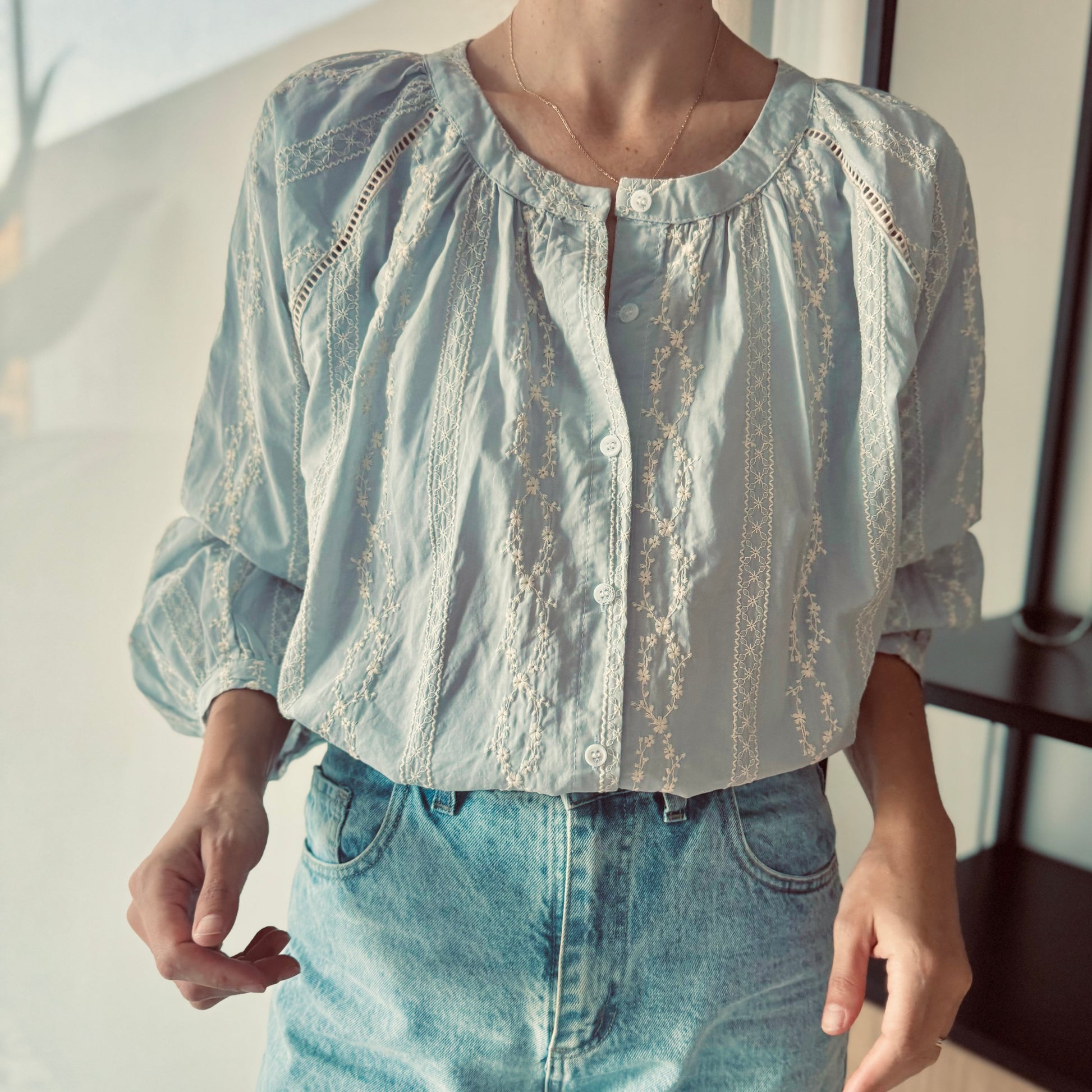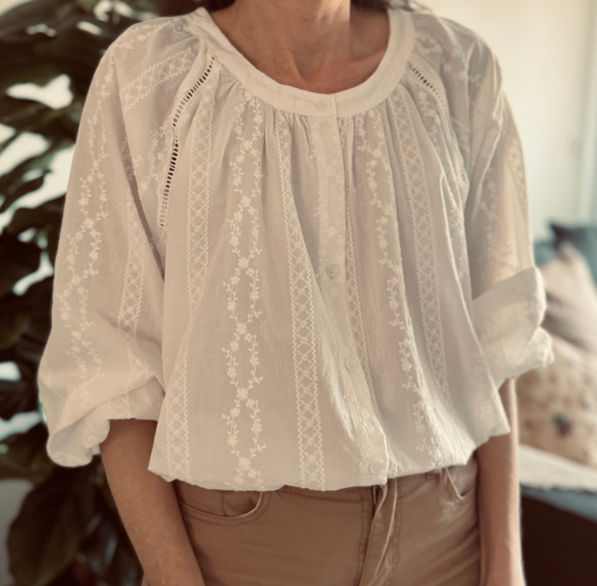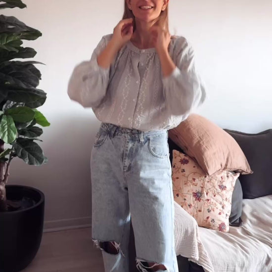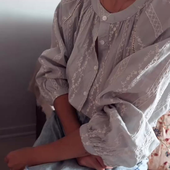 Camisa con detalle de tiras bordadas. Fragmento con tira ahuecada. s