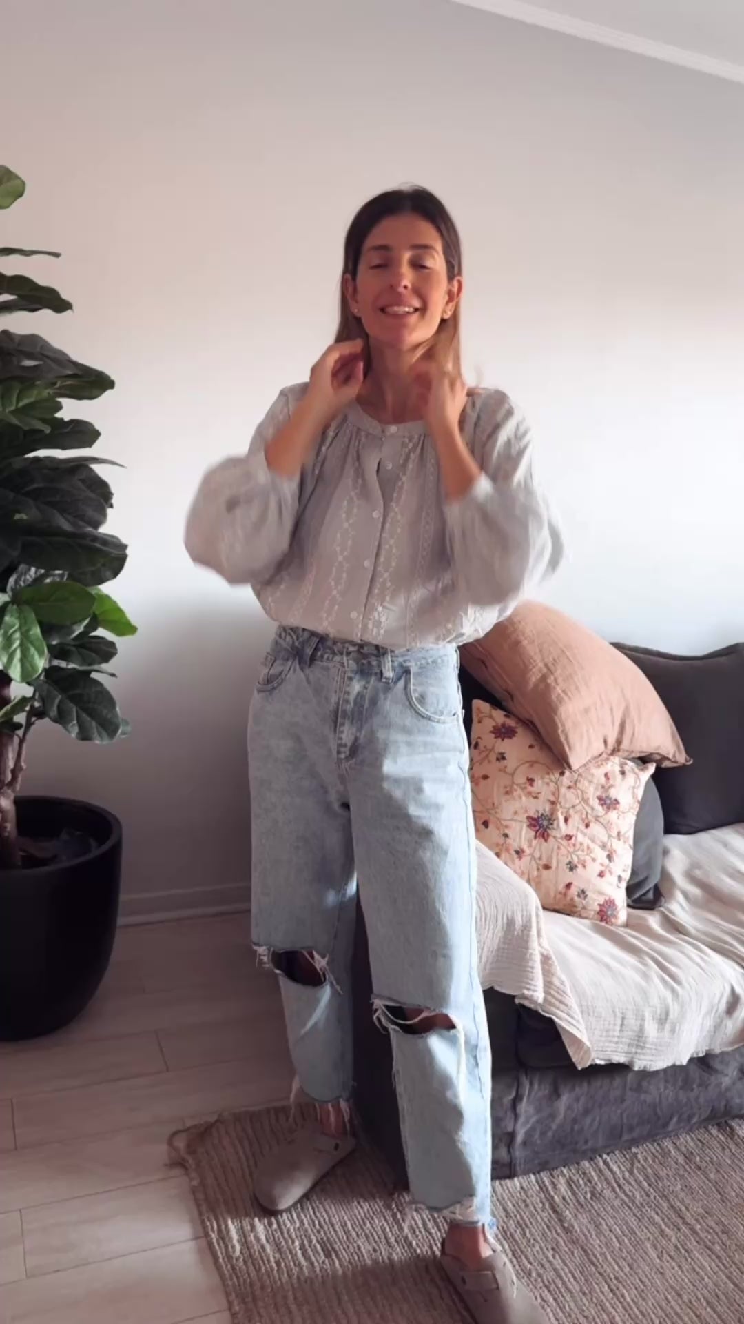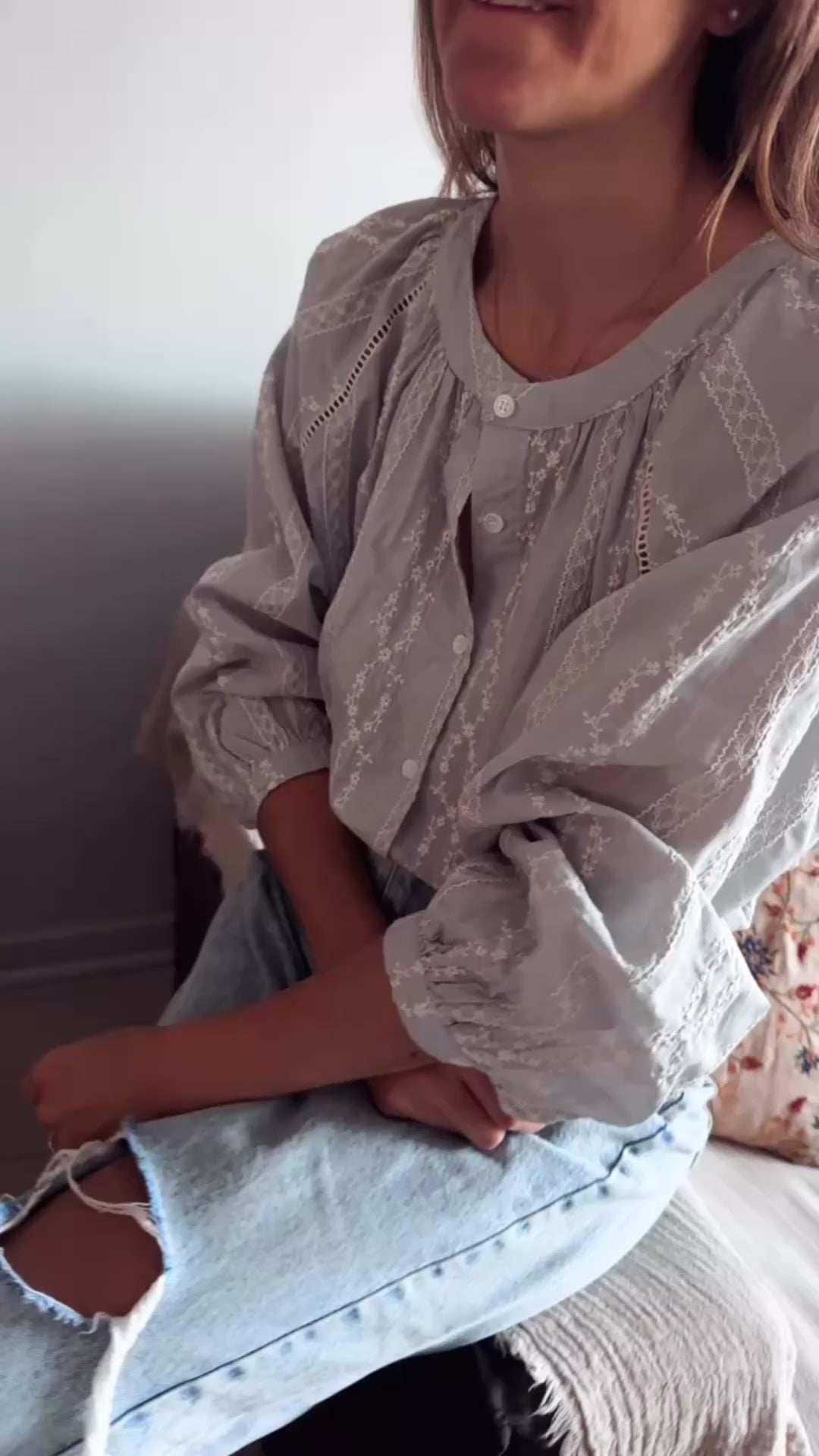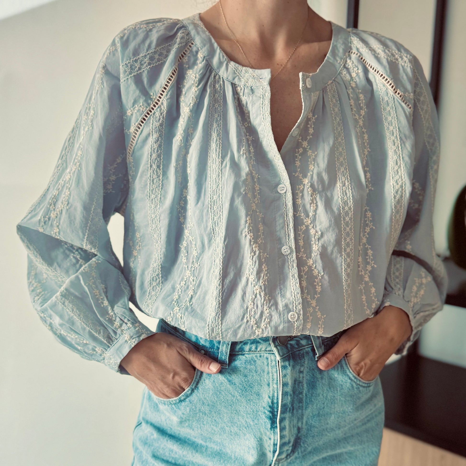 Camisa con detalle de tiras bordadas. Fragmento con tira ahuecada. s