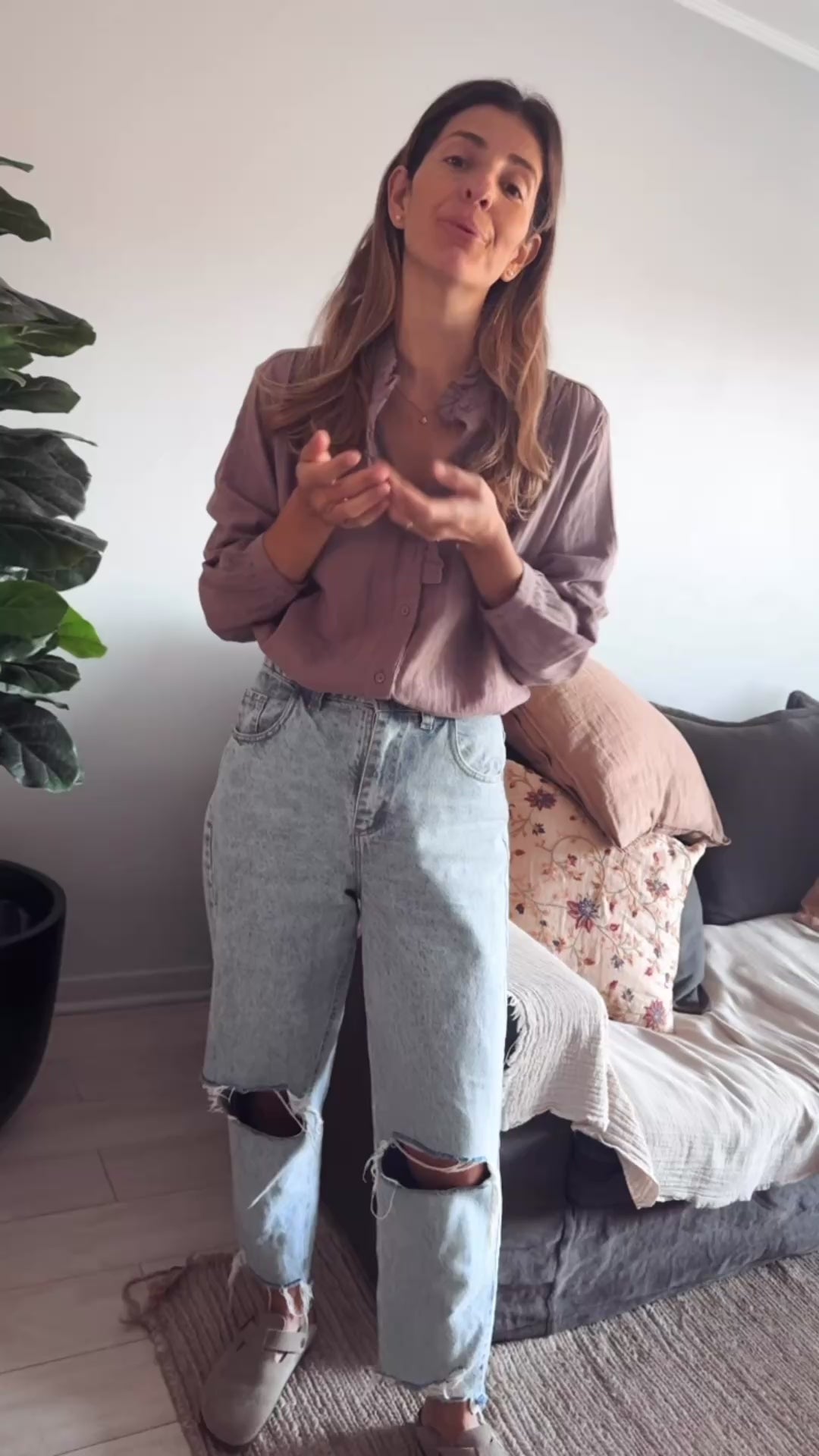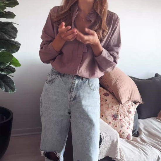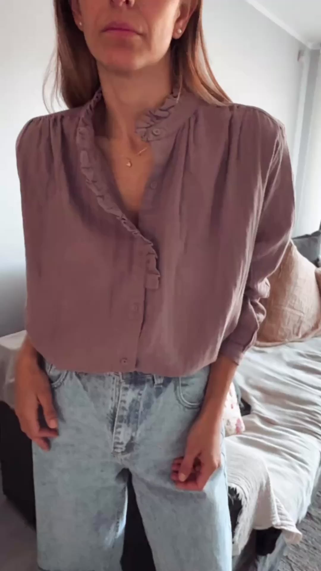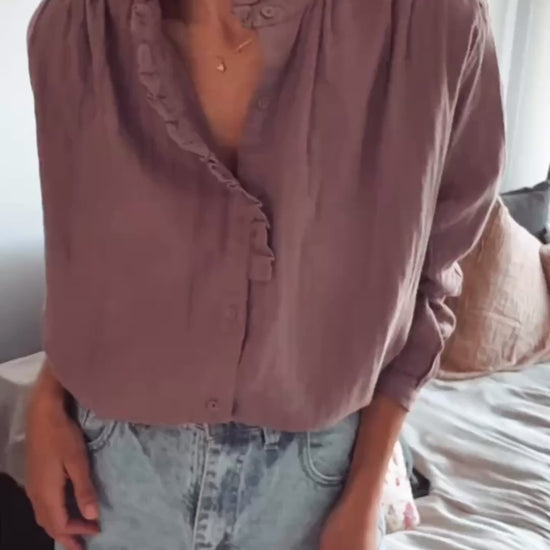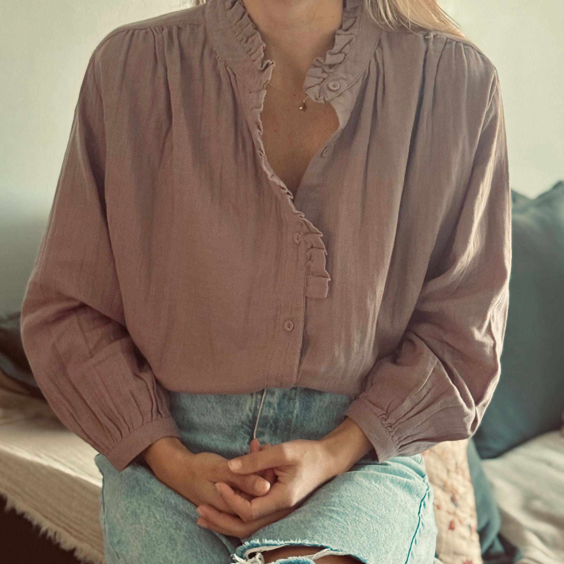 Camisa con botones forrados y leve volado en cuello. Mismo volado en una parte delantera