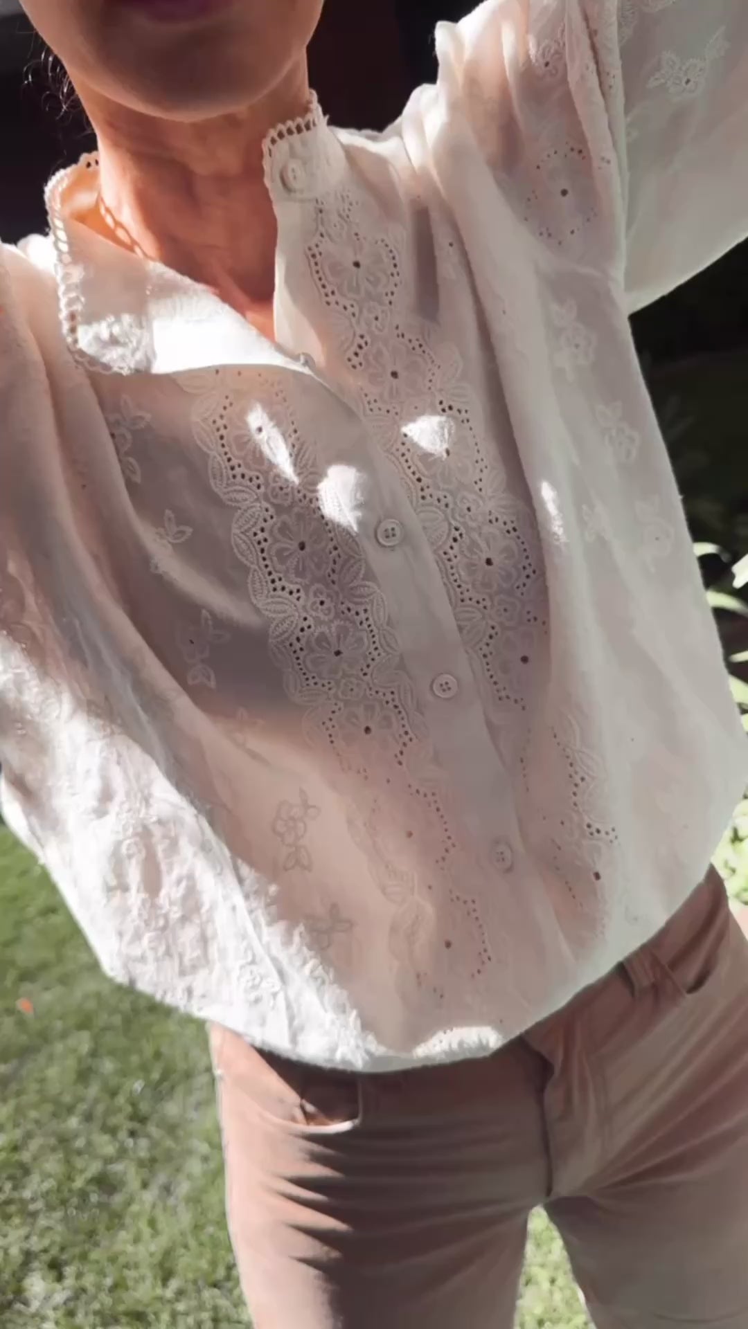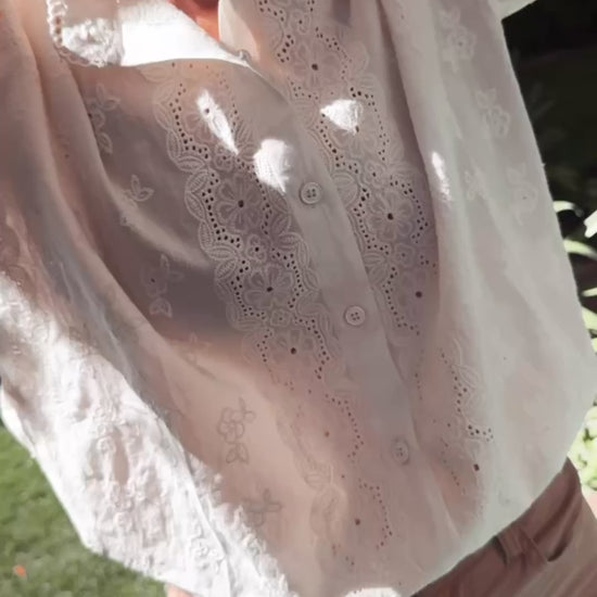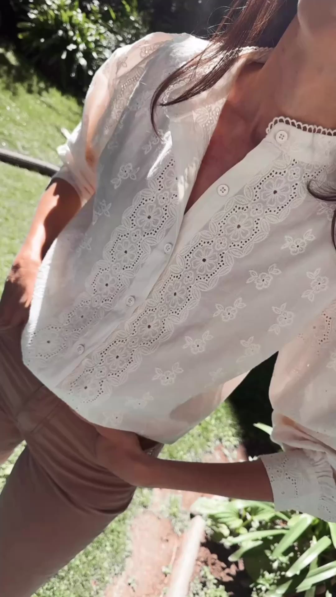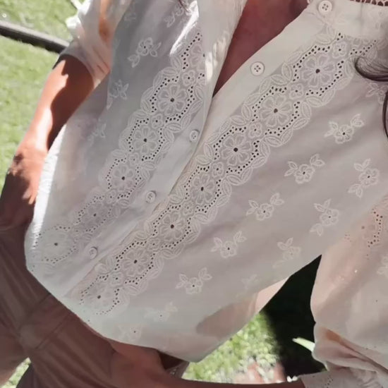 Camisa integra de broderie con detalle de puntilla en cuello y dos tiras laterales con flores.