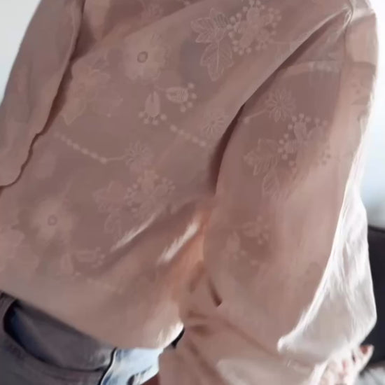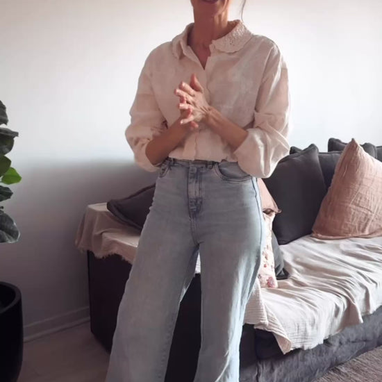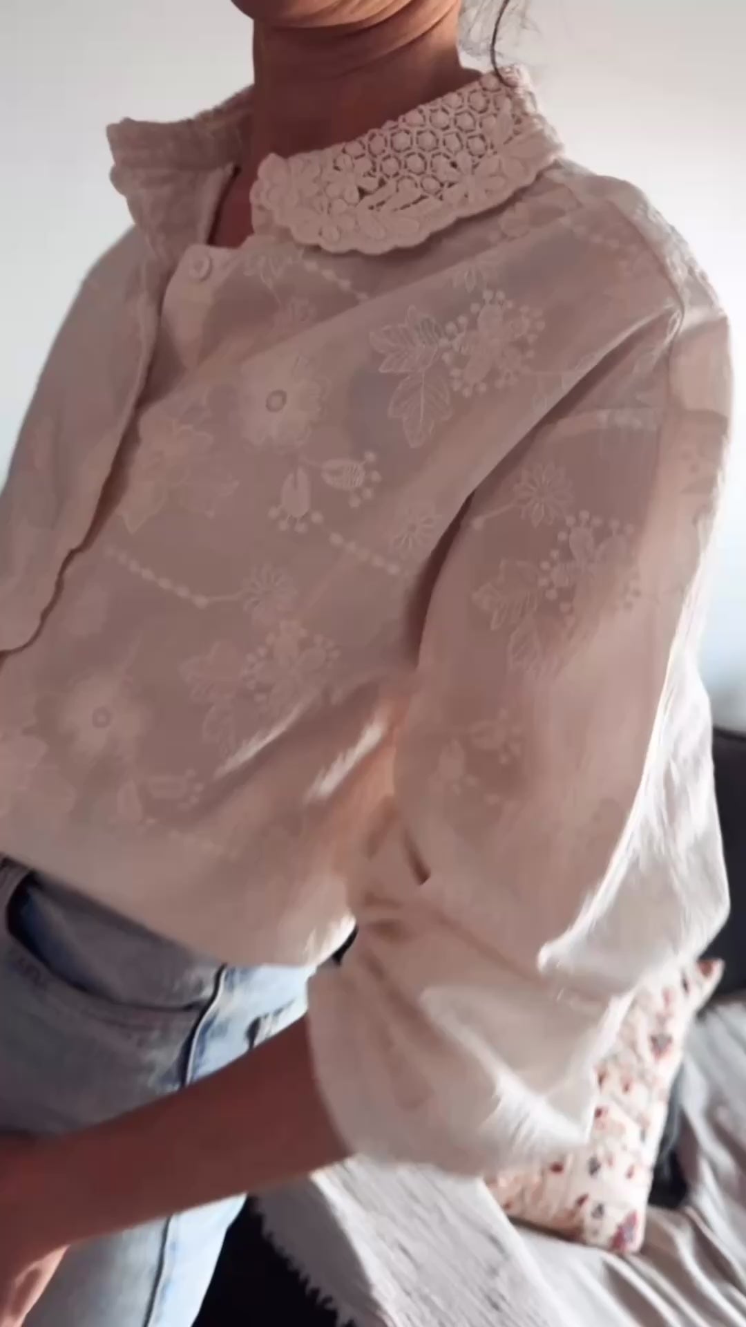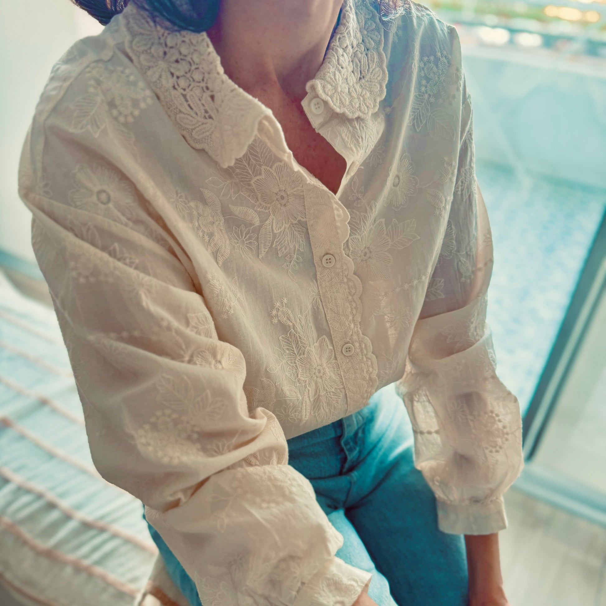 Camisa corte tradicional. Botones forrados. Detalle de tela de puntilla superpuesta.