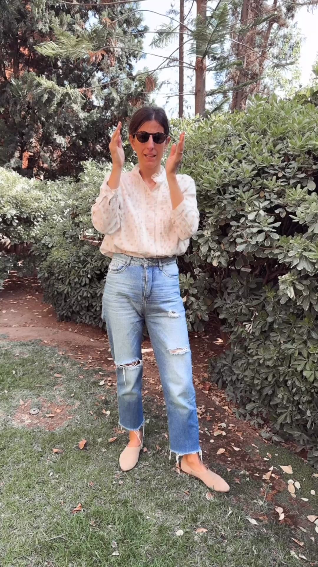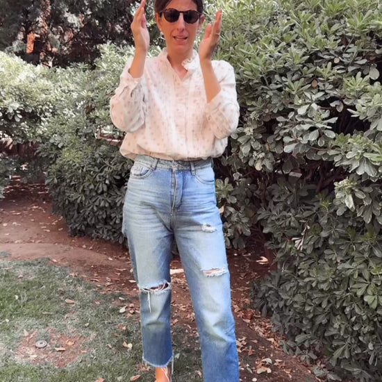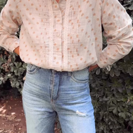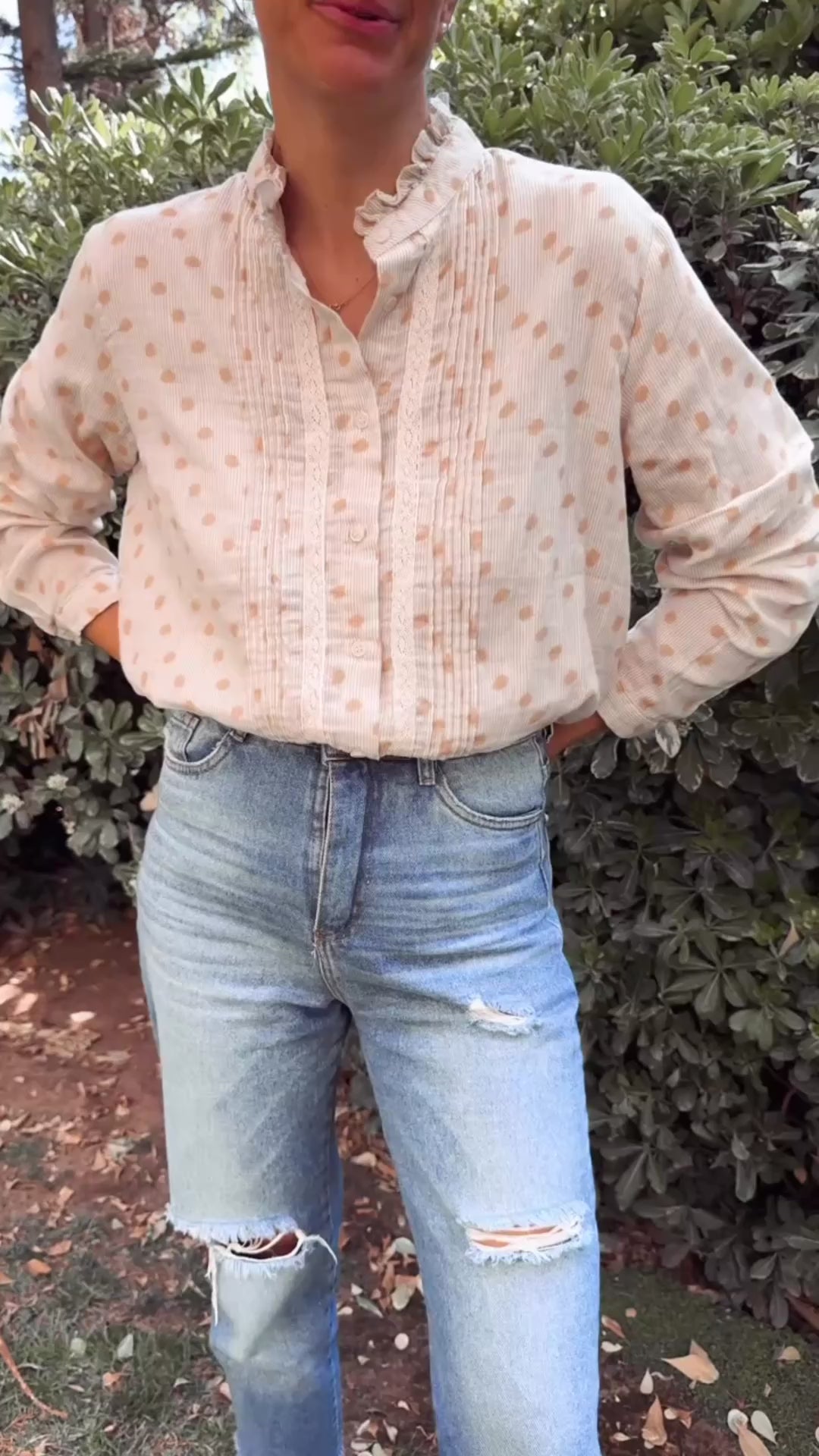 Camisa con lunares amarillos. Tela con estampa rayada beige y khakhi. Detalle de alforzas y puntilla laterales. Volado en cuello