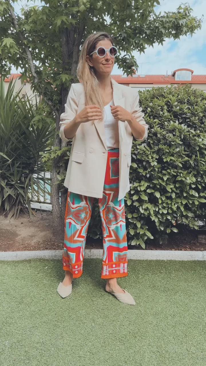 Pantalón con estampado de hojas tropicales simil seda. Bolsillos laterales y elástico en cintura.